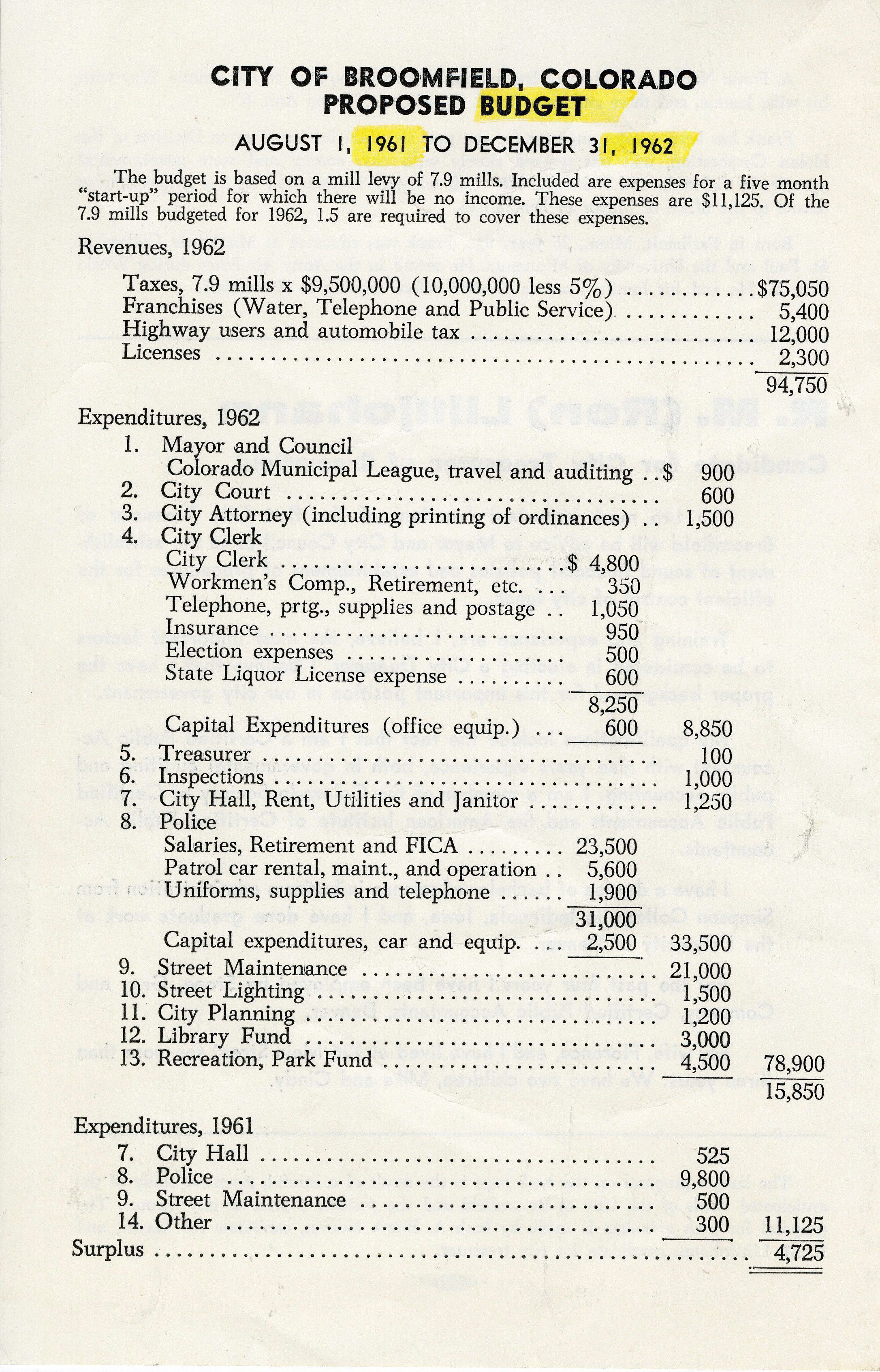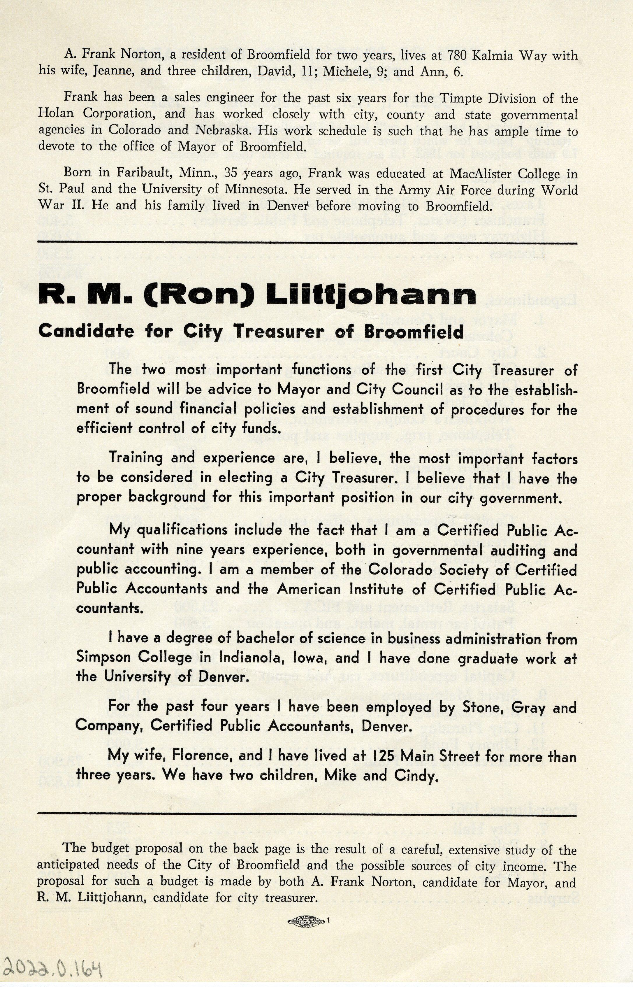 Single half sheet of white paper with the title "City of Broomfield, Colorado Proposed Budget August 1, 1961 to December 31, 1962". Front side outlines a proposed budget based on a mill levy of 7.9 mills. Includes estimated revenues for 1962 ($94,750) and expenditures for the remainder of 1961 and all of 1962. The reverse side states that this budget was put together by A. Frank Norton, candidate for Mayor, and R.L. "Ron" Liittjohann, candidate for Treasurer, and includes bios and campaign promises for both. This item relates to the early founding years of Broomfield, likely its first mayoral election.