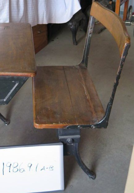 This is a chair, part of a school desk-chair set, with a black metal frame, dark wood seat, and dark wood back rest. There is a hole for an ink well and a slot for pencils/pens. The chair measures 30.5" (h) x 22" (w) x 13 (d)".