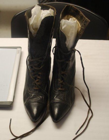 This is one pair of black leather high top ladies shoes with laces. The shoes have a pointed toe. They each measure 10" (h) x 3.25"(w) x 10"(l).