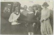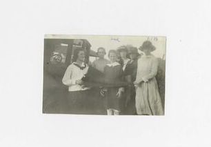 Black and white photograph of a group of people. The two women in front are identified as Sal and Lib.