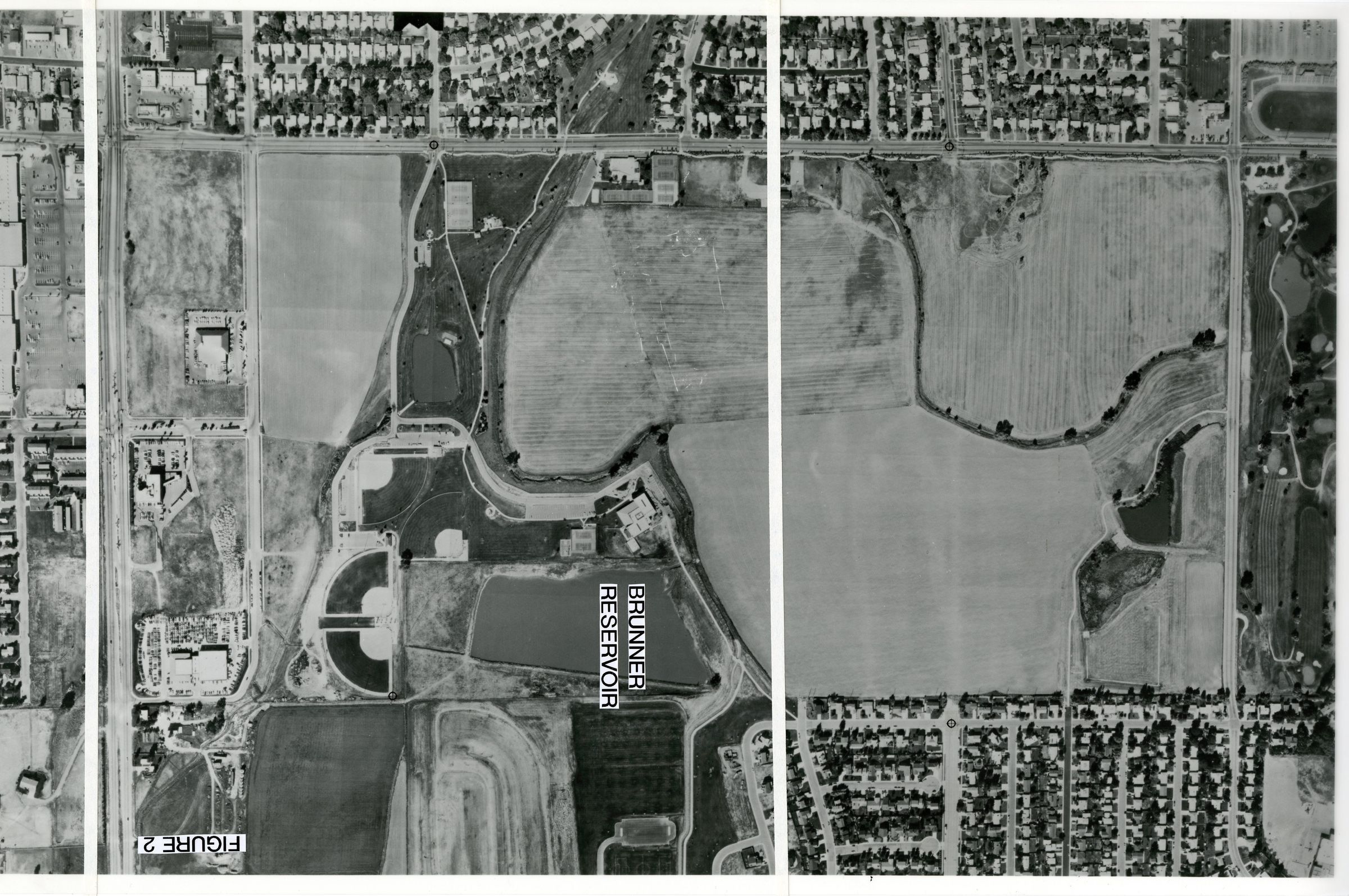 Item is a black-and-white partially transparent map of Broomfield showing undeveloped land, including where the Mamie Doud Eisenhower Library will be built later on, and the baseball diamonds. The map is split into sections by two white paper lines that were glued to its surface, and the Brunner Reservoir is labeled in a section titled "Figure 2."Photograph Details