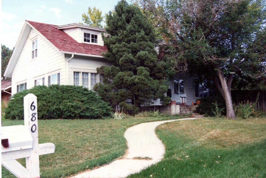 Colored photograph of the Zang house painted in white with a red roof and walkway leading up to it. White mailbox in the foreground reading 680. Located at 680 Poppy Way.