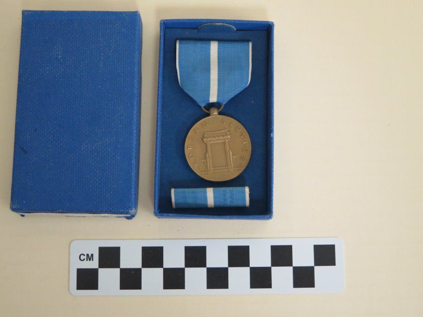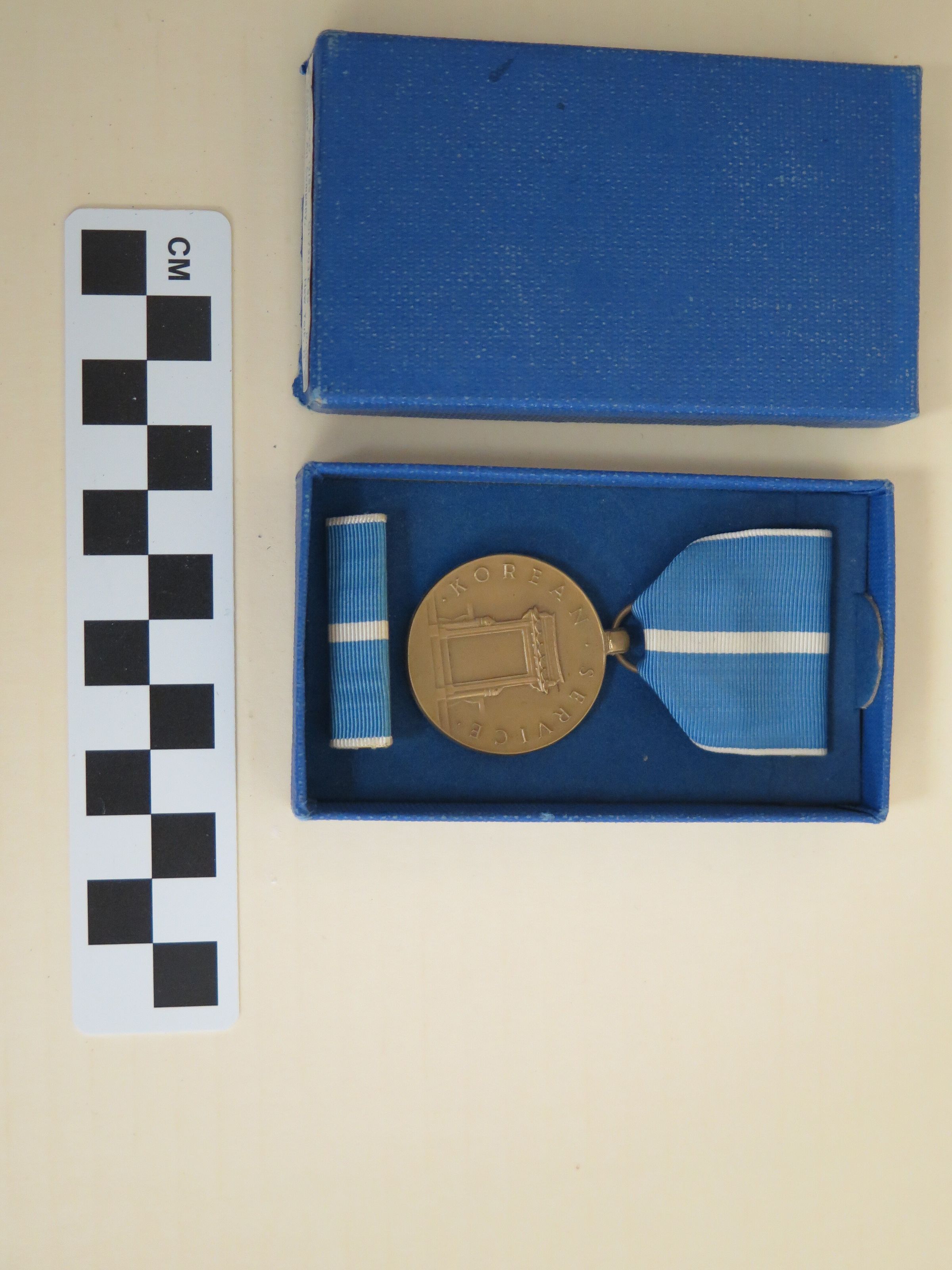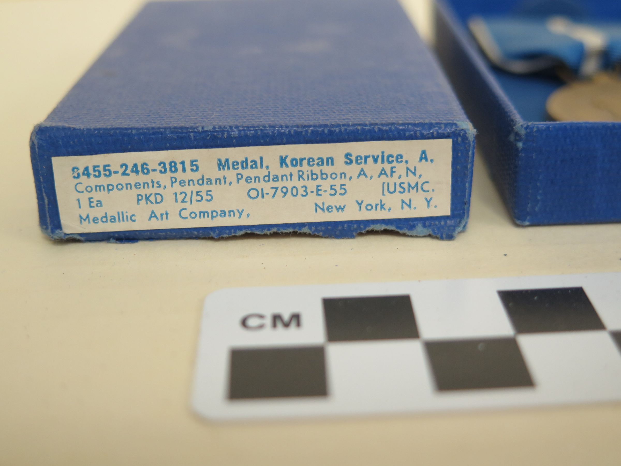 This is a military medal stored in a blue box. The medal is for Korean Service. Included in the box is the medal, the ribbon, and the ribbon bar holder. The box measures 1" (h) x 2"(w) x 4" (l).