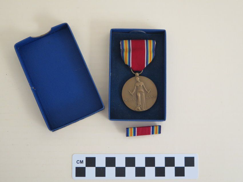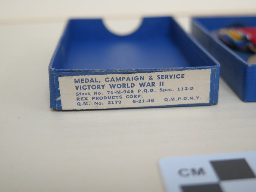 This is a military medal in a blue box. The medal is for Campaign and Service in the Victory of World War II. The box includes the medal, ribbon, and ribbon bar holder. The box measures 1" (h) x 2"(w) x 4" (l).