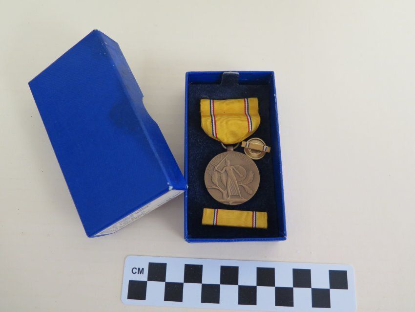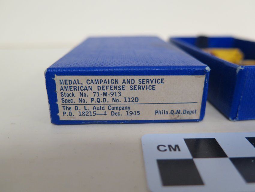 This is a military medal in a blue box. The medal is for American Defense Service. The box includes the medal, lapel pin, ribbon, and ribbon bar holder. The box measures 1" (h) x 2"(w) x 4" (l).