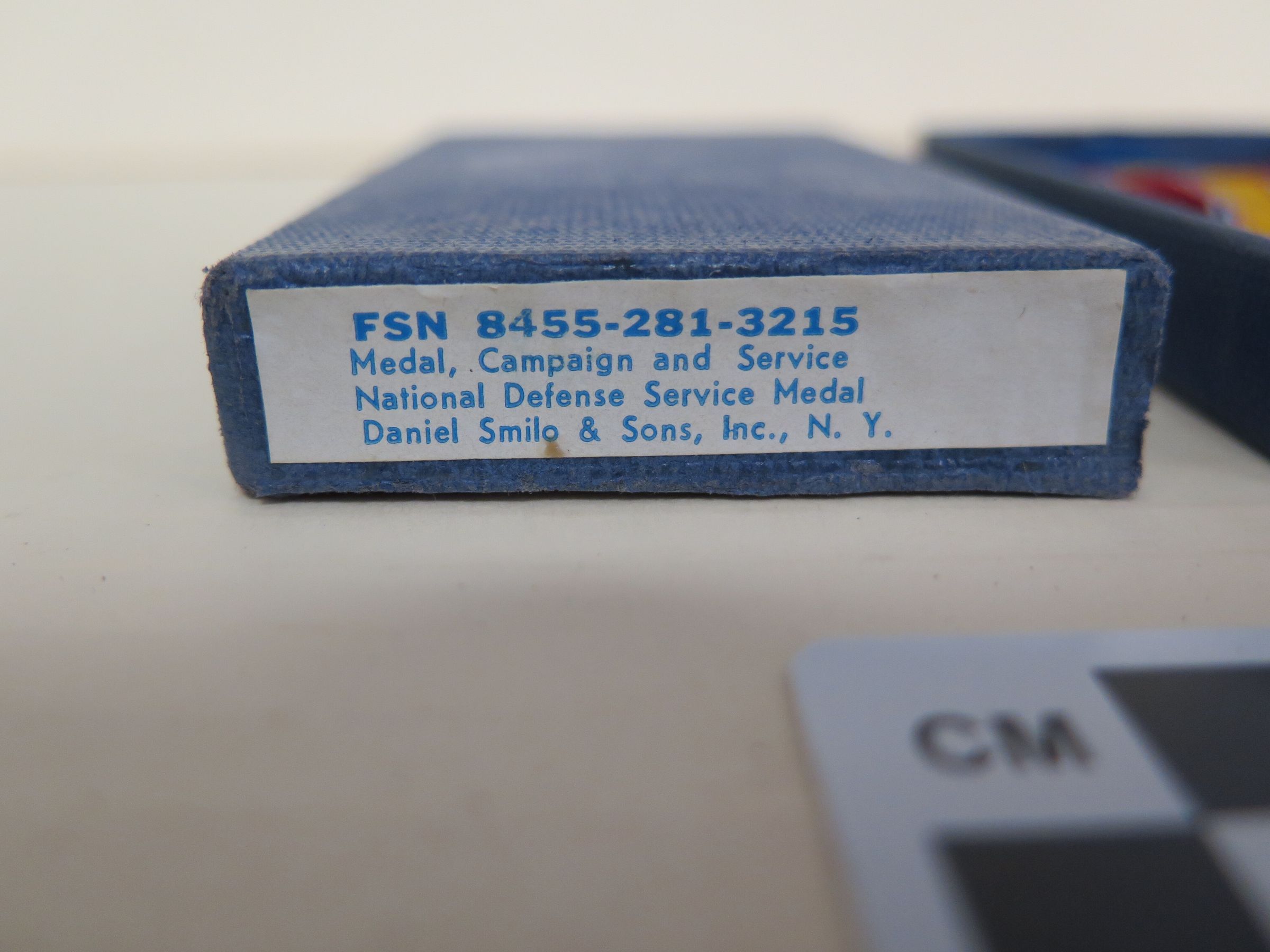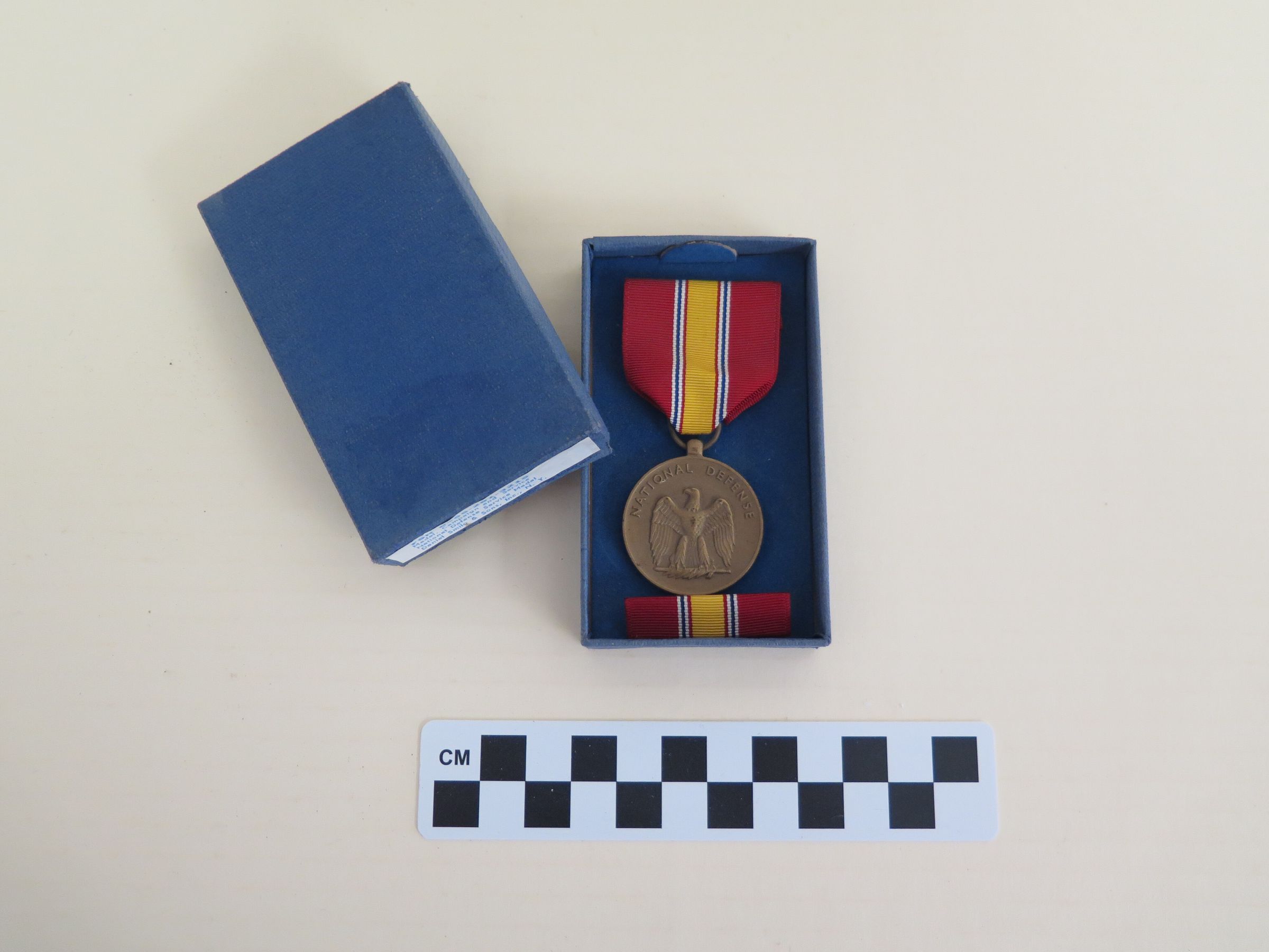 This is a military medal in a blue box. The medal is for National Defense. The box includes the medal, ribbon, and ribbon bar holder. The box measures 1" (h) x 2"(w) x 4" (l).