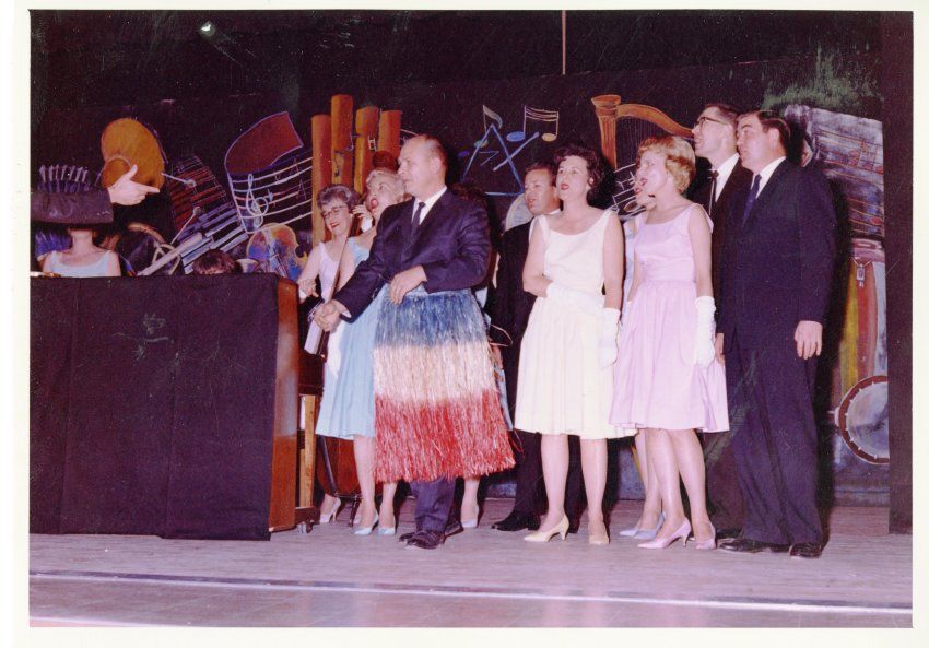 Colored photograph of Broomfield Swing Choir on stage. Dick Mullen conducts. Women wearing pastel dresses in front with men wearing suits in back. With David James in a red, white and blue skirt.