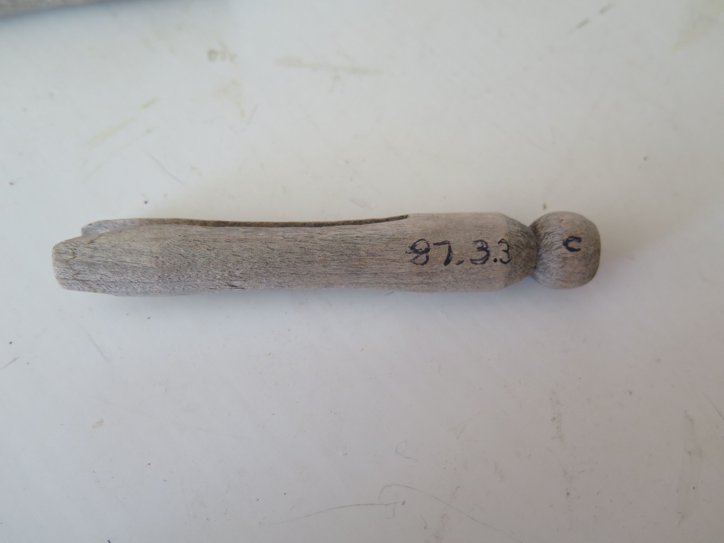 Wooden clothespin. The clothespin measures 3.75" (l) x 0.5" (diam).