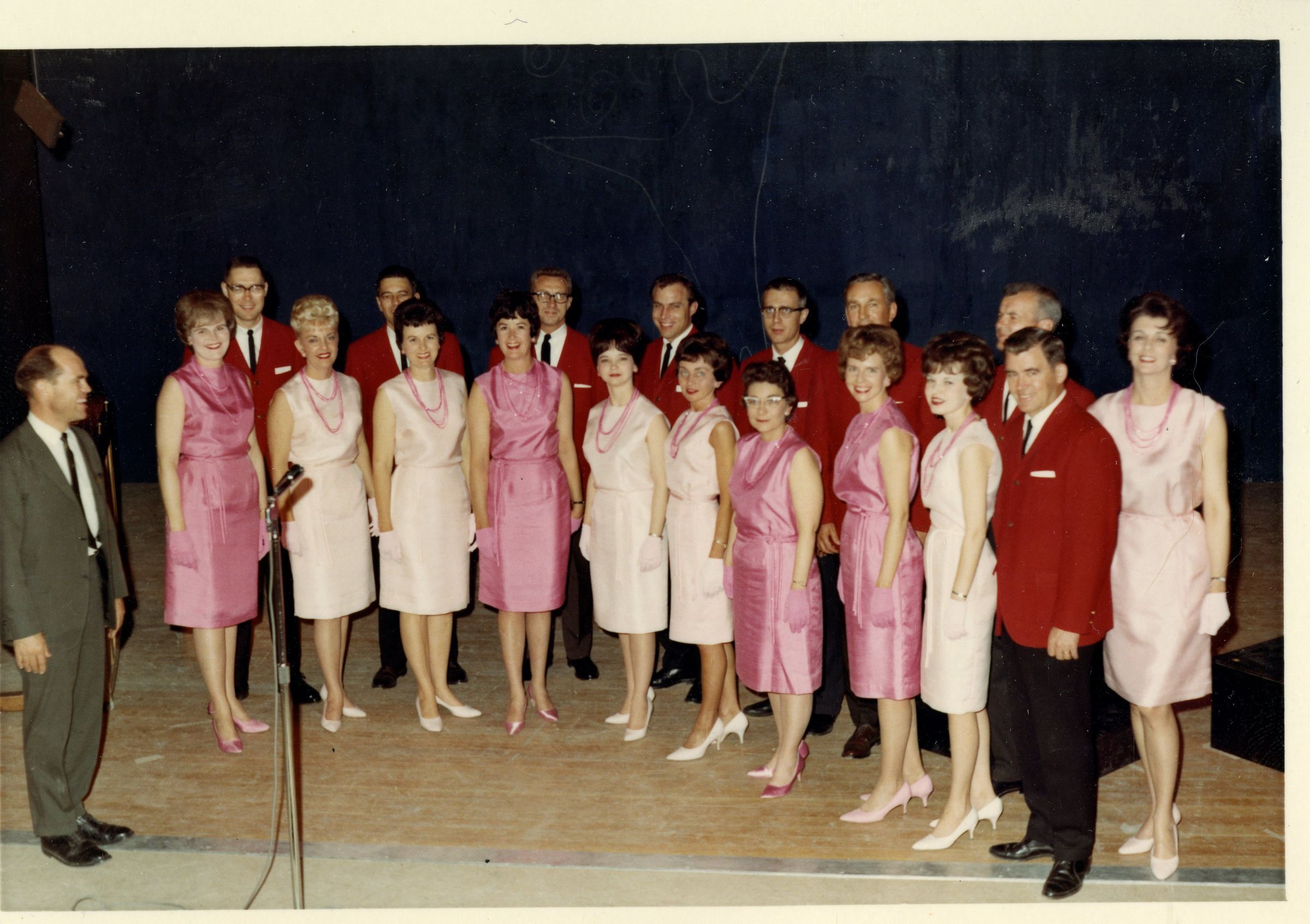 Colored photograph of Broomfield Swing Choir on stage. Women in pink dresses standing in front of men in red suits.