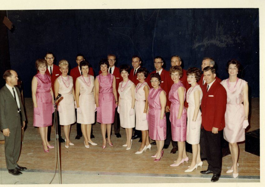 Members of the choir at this time were likely the following (based on member lists and in no order correlating to photo): Lou Dan Byers, Carrie Brunner, Mary Ann Castens, Thelma Dawson, Caroll Herrmann, Dave and Pattie James, Lois and Norman Jouett, Edwin Langmald, Pat and Ken Jordahl, Sam Miller, Ev and Dick Mullen, Doris Ogborn, Dea Ponsor, Mary Popejoy, Anita and Randall Shelton, Jim Parker, Eileen Sundburg, Charles VanMeter, Bill Woodis and the accompanist, and Margaret Klawuhn.
