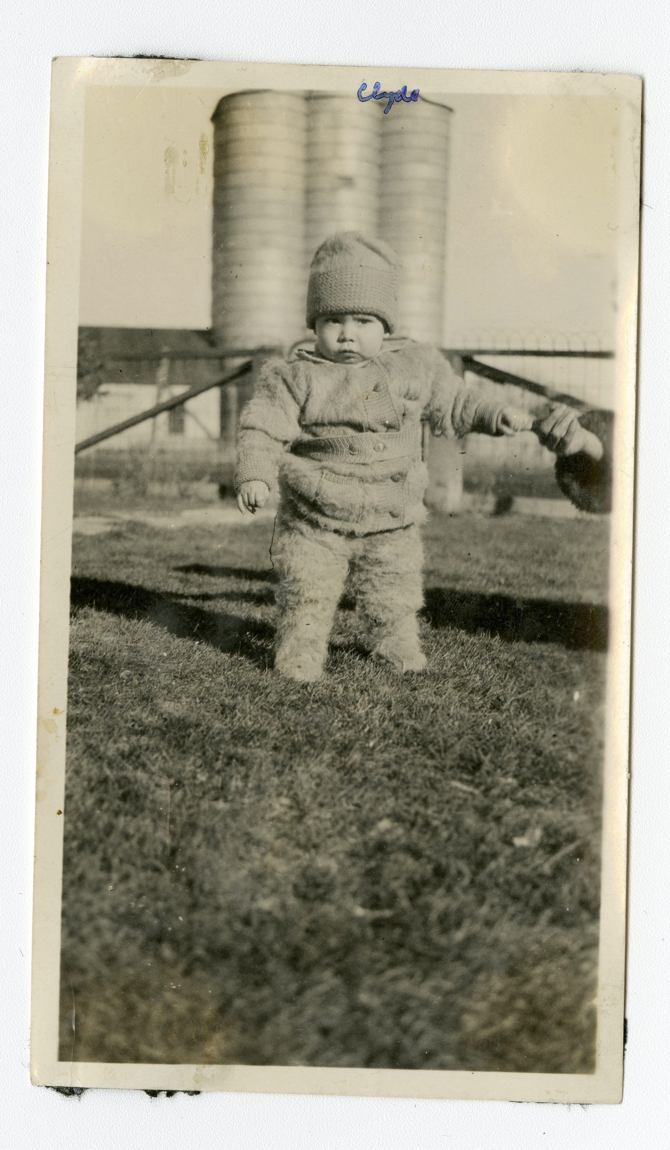Black and white photograph of Clyde Brunner outside. A grain silo is in the background. Photograph probably taken in fall or winter. Clyde is holding the hand of a person who is out of frame.