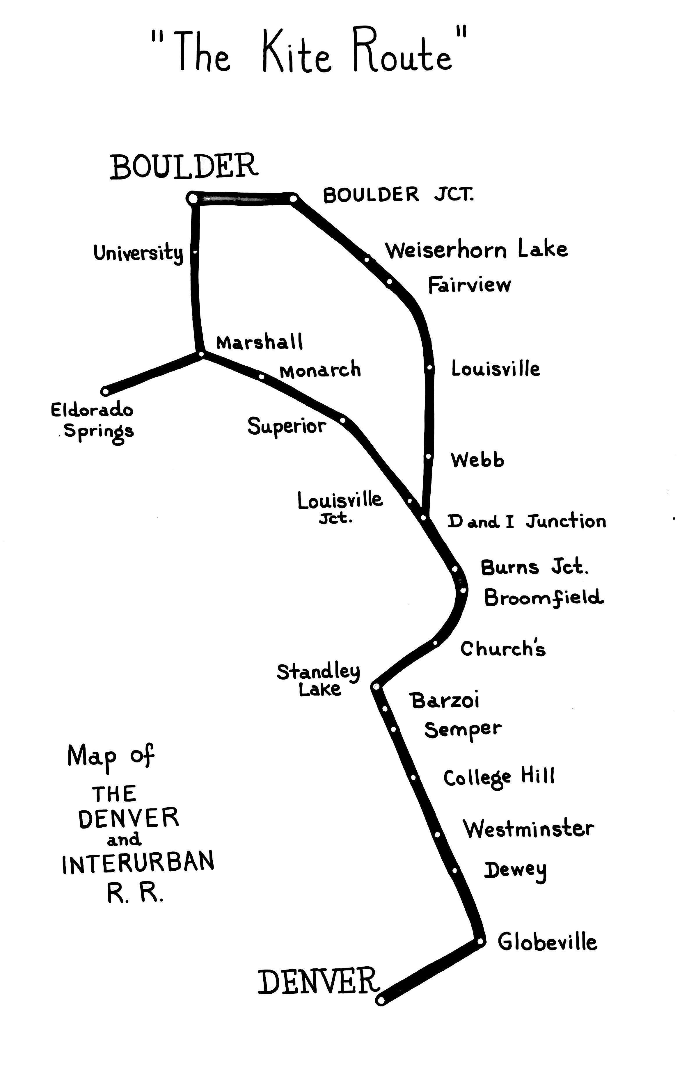 Digital scan of a hand drawn map of the Kite Route (The Denver and Interurban Railroad) used in the Depot exhibit. Shows all the stops on the Kite Route, including Broomfield and Burns Junction.
