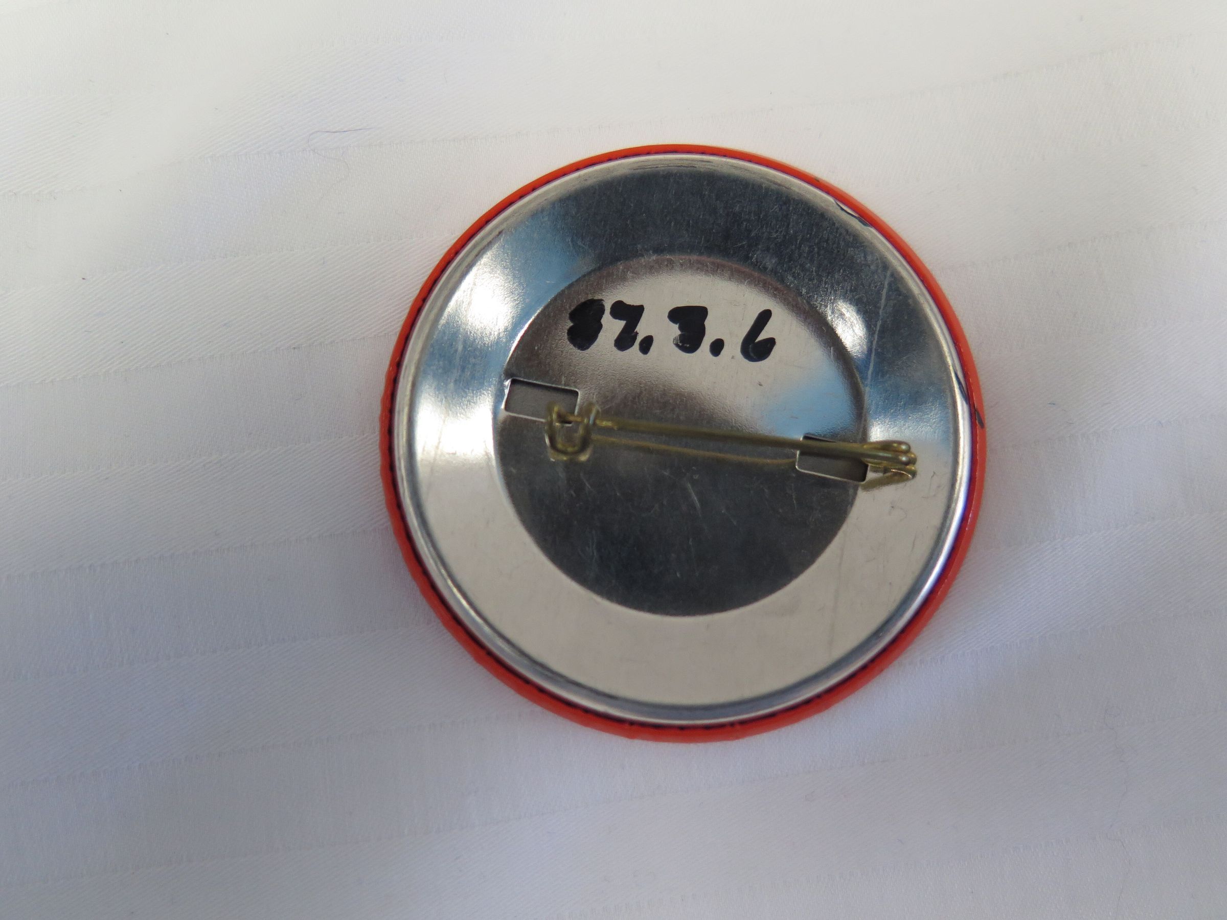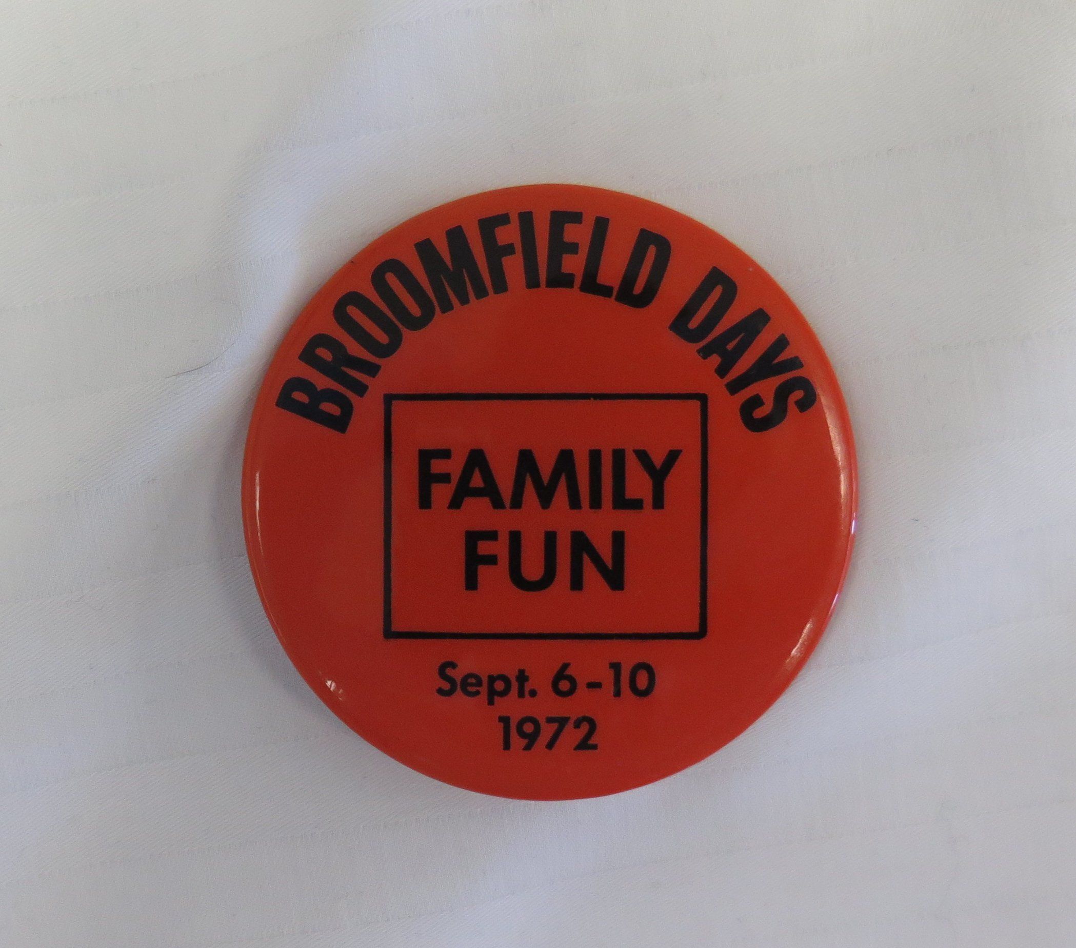 This is a red button with a pin closure on the back. The text on the front of the button reads, "Broomfield Days/ Family/ Fun/ Sept. 6-10/ 1972". The button measures 2.25" (dia).Collection