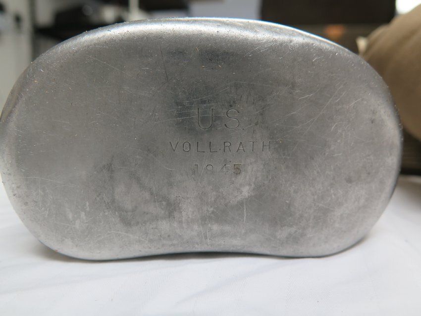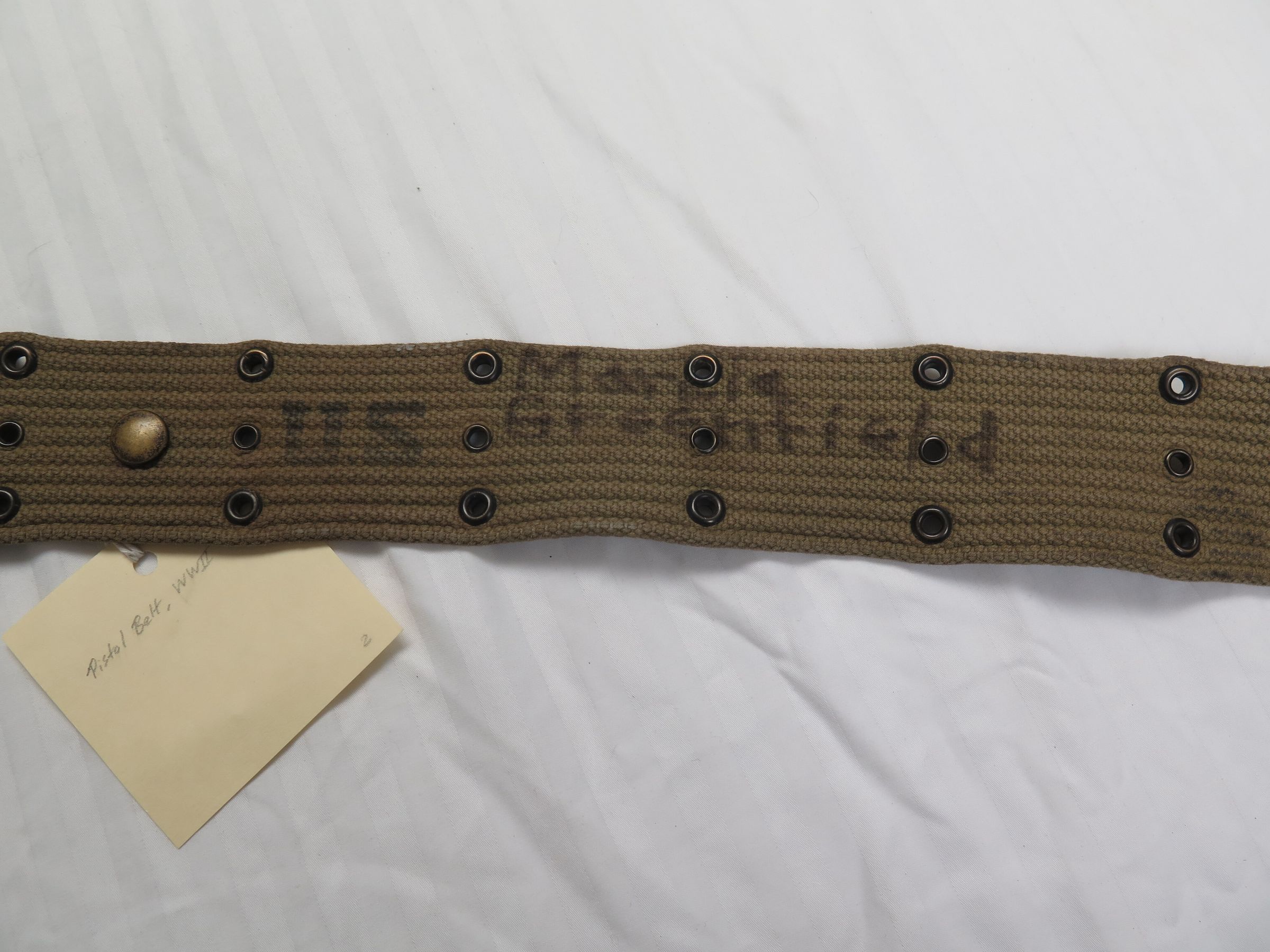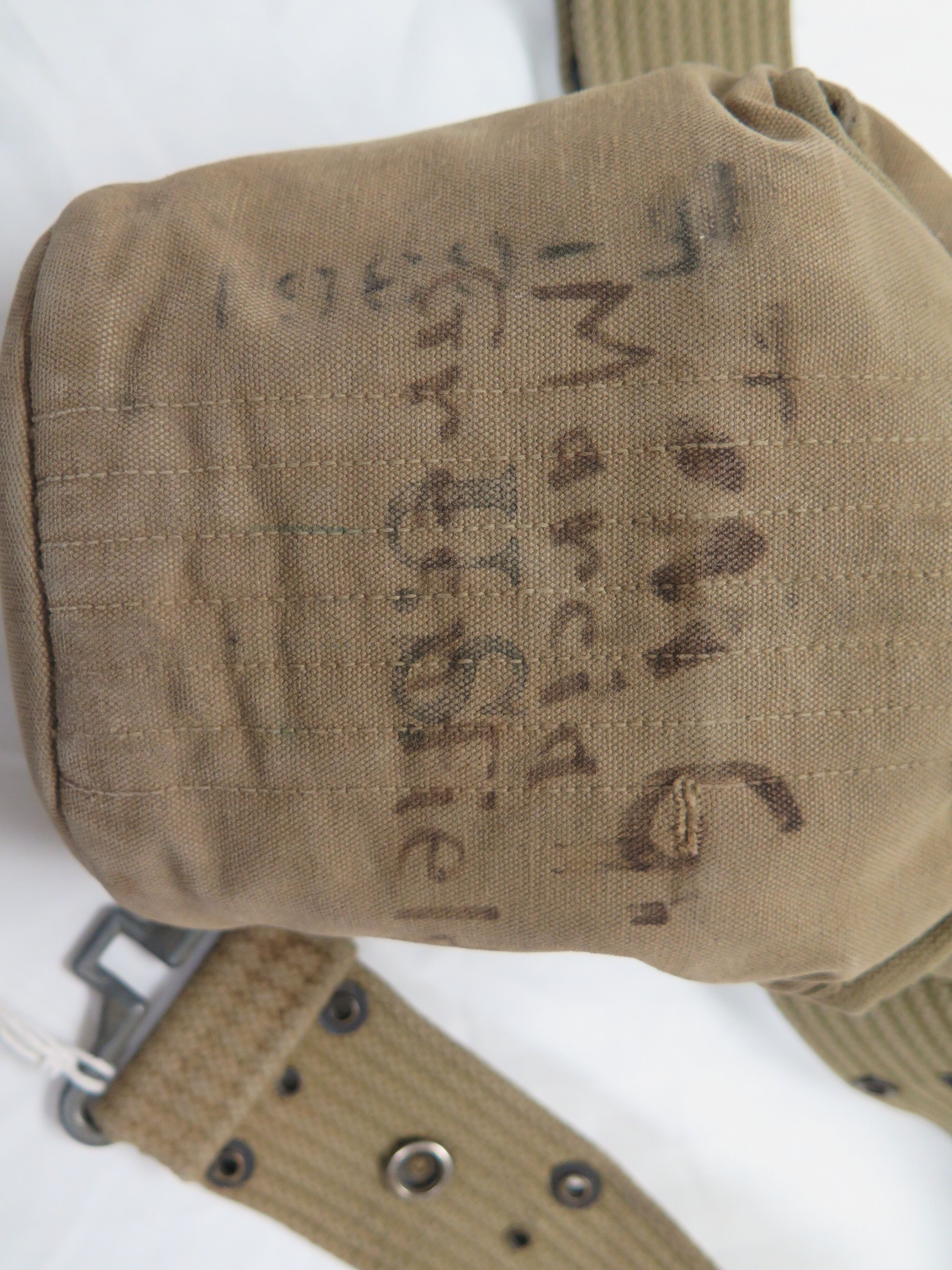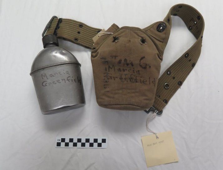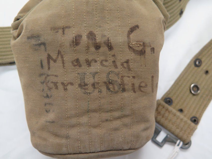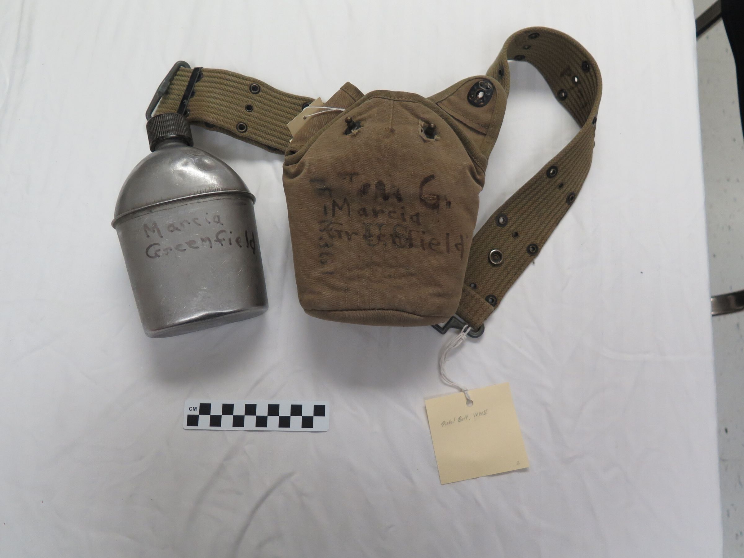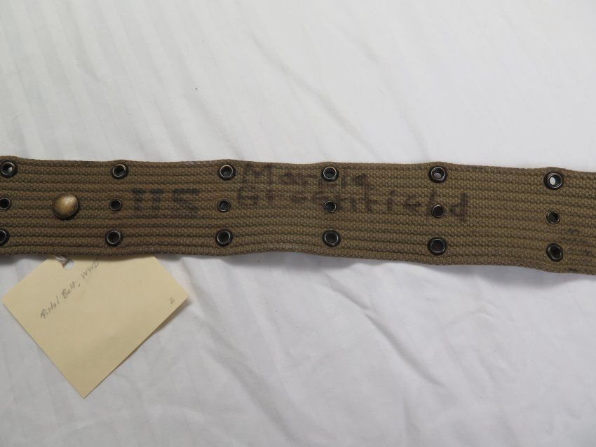 Canteen, canteen cover, and pistol belt. The canteen (a) is metal with a plastic lid. Bottom is stamped "U.S./Vollrath/1945"on the bottom. The cover (b) is cotton canvas olive drab and the interior is lined with gray wool fabric. The pistol belt (c) is stamped "U.S." All three objects have the name Marcia Greenfield written on them in marker.
