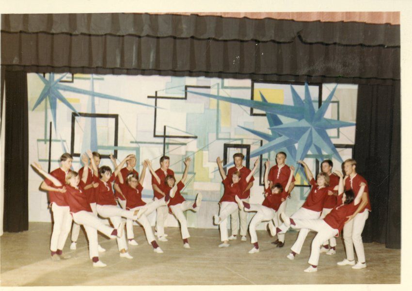Colored photograph of children/teens in red shirts and white pants trust falling, likely part of a choral concert/performance. Photo part of a series from the Broomfield Swing Choir.