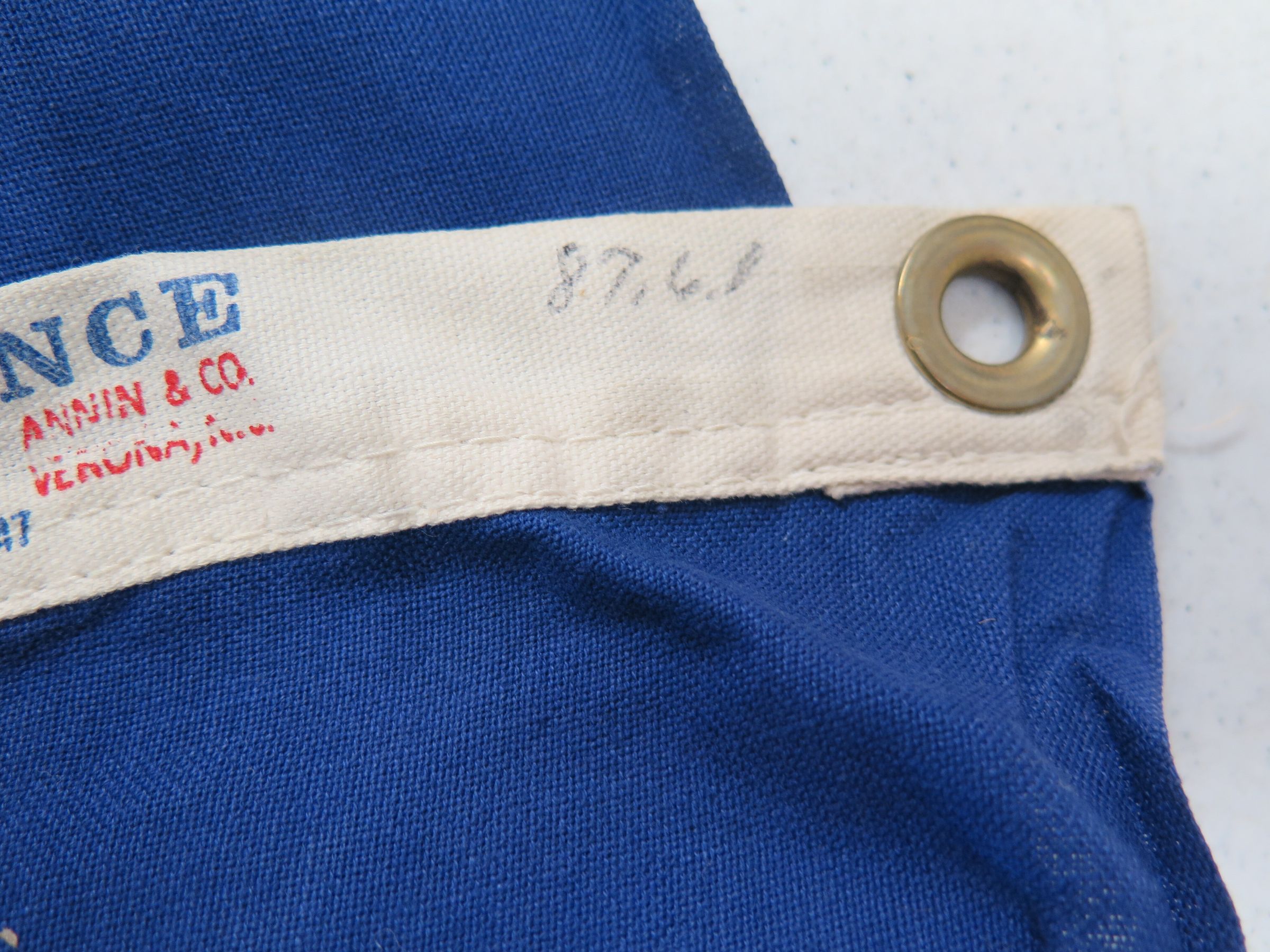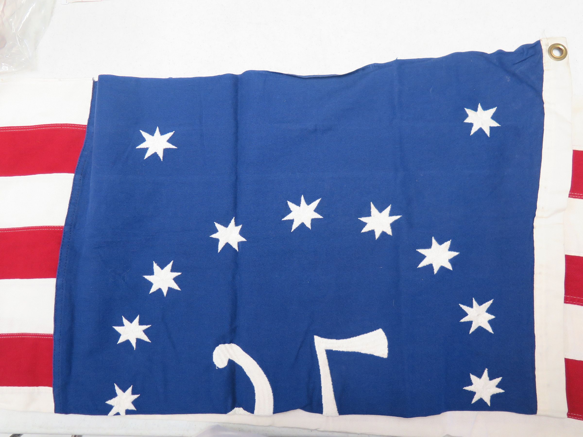 This is a US Bi-Centennial flag. It is blue material in the left corner of the flag, with "76" displayed in the center. There is a circle of stars around "76" as well as one in each corner of the blue material. There are a total of 12 stars. The remainder of the flag is red and white stripes. The flag measures 30" (w) x 60" (l).
