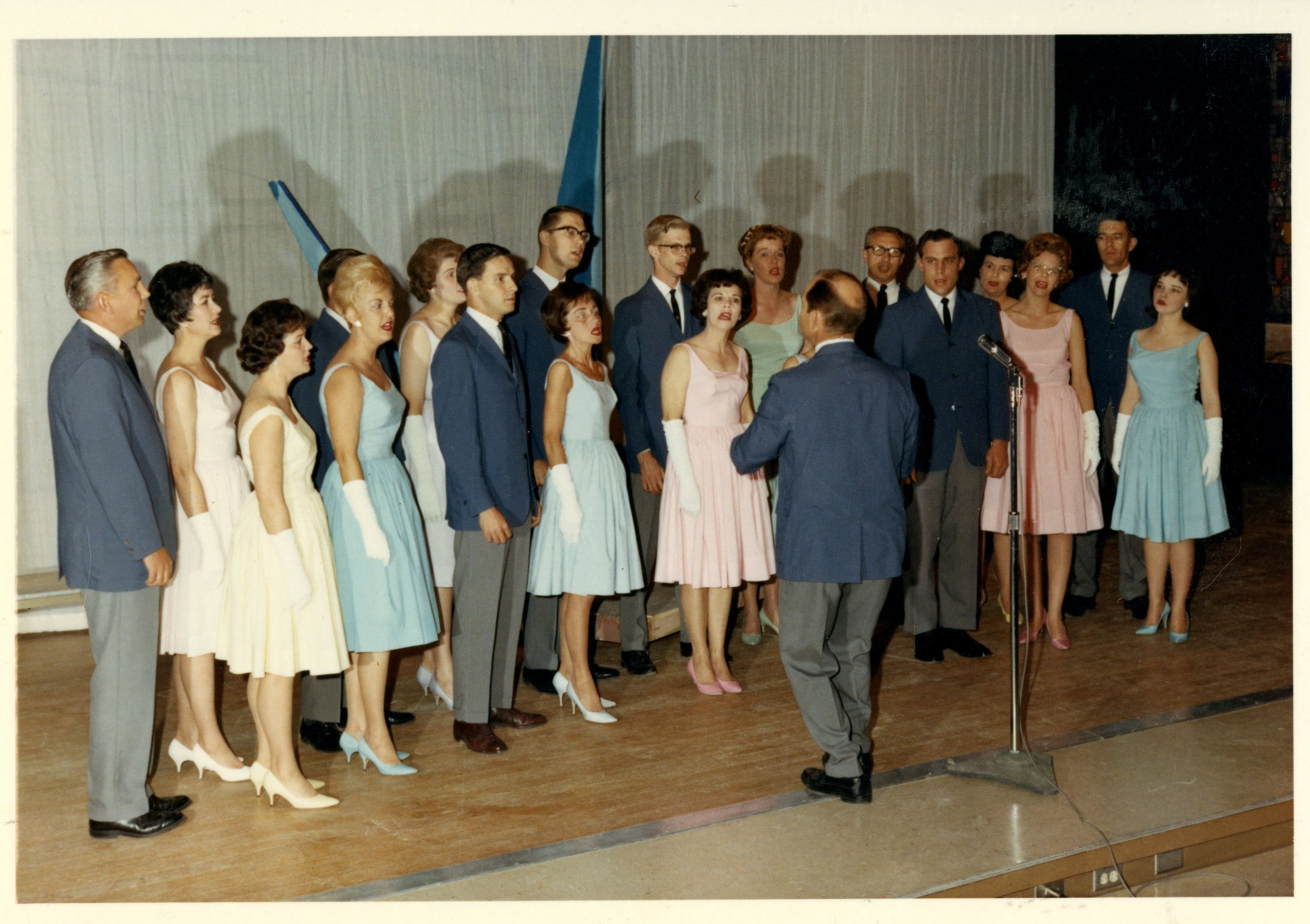 Colored photograph of Broomfield Swing Choir on stage. Dick Mullen conducts. Women wearing pastel colored dresses and men in blue suits.