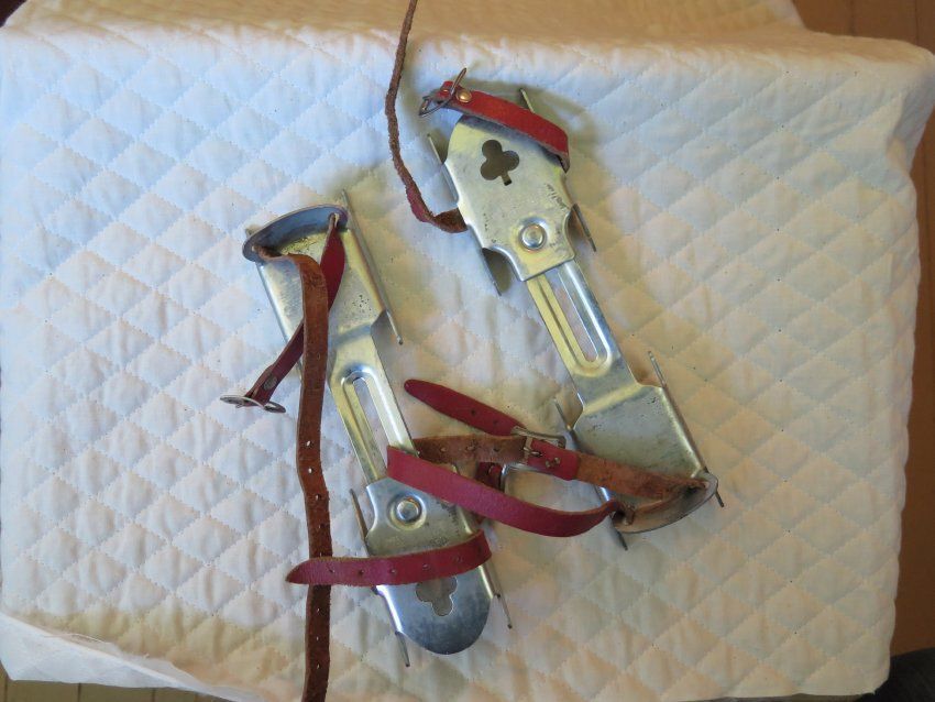 A pair of metal children's stap-on ice skates with red leather straps. The "Bob Ice Skates" are made by the Union Hardware company and each measures 9"(l) x 2"(w) x 2"(h).