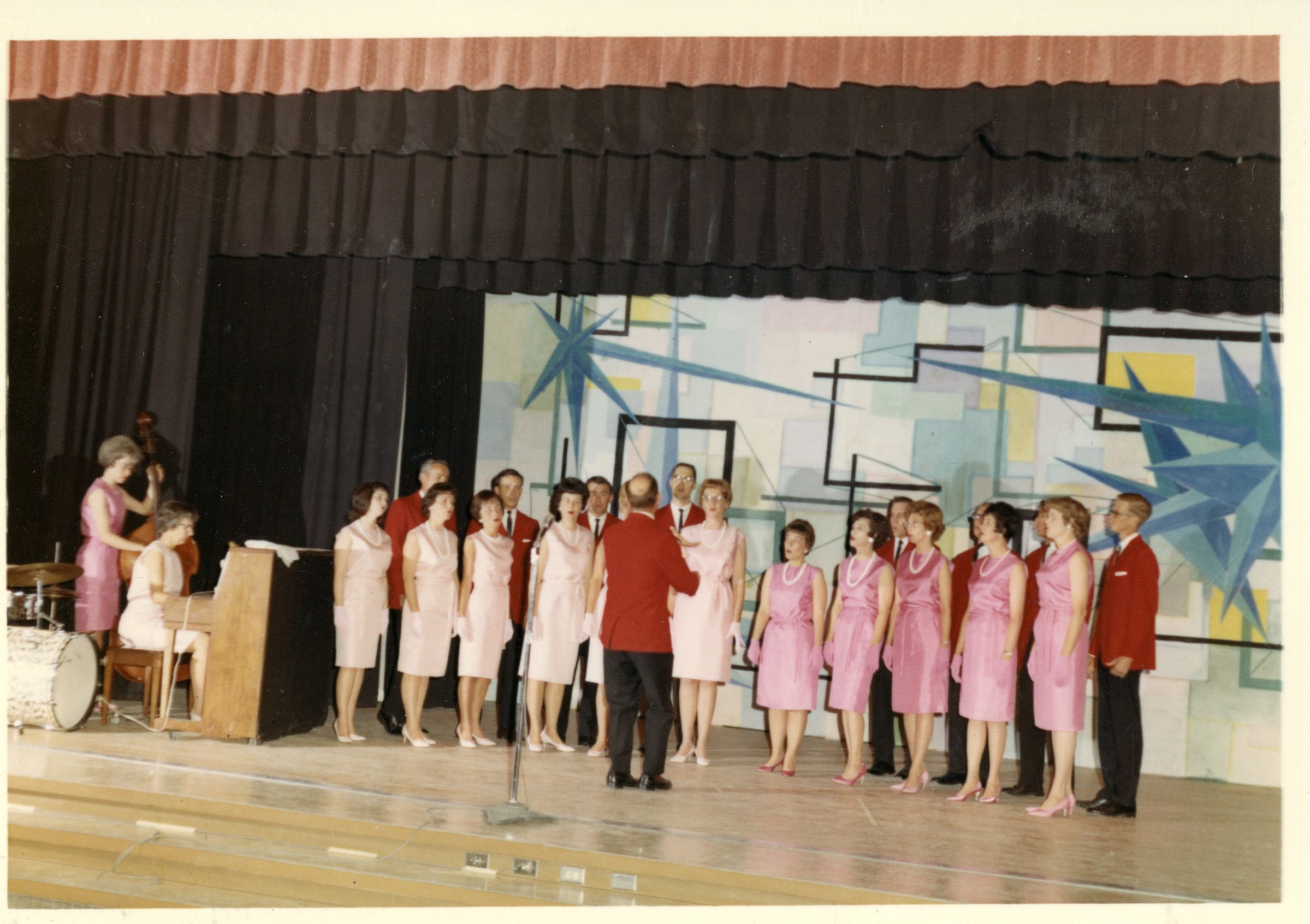 Colored photograph of Broomfield Swing Choir on stage. Dick Mullen conducts. Women wearing pink dresses in front of men in red suits. With blue funky geometrc shapes background.