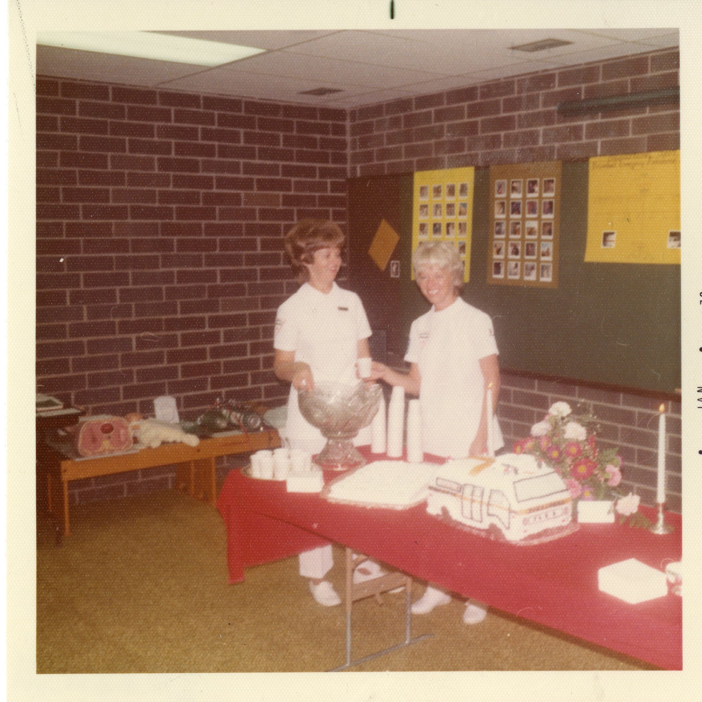 2 ladies by a big red tables with flowers.