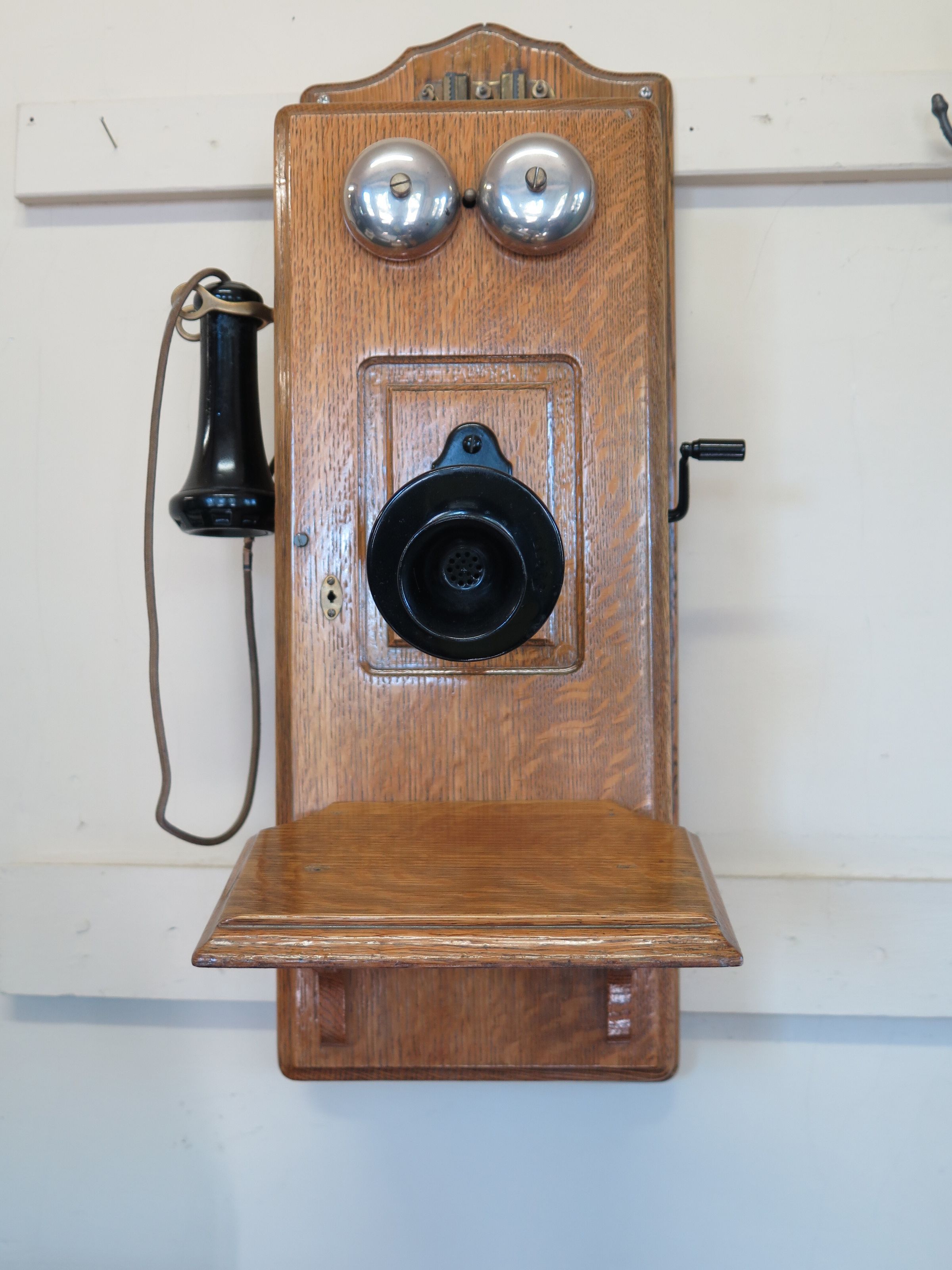 This is a wood wall mount telephone. The wood case is rectangular with an angled ledge at the bottom and two metal bells at top. The receiver hook and receiver on a cord are on the left side. The crank is on the right. The telephone measures 25.5" (h) x 14" (w) x 14" (w).