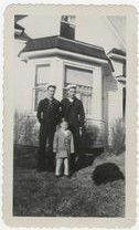 Black and white photograph of two men, a boy, and a dog in front of a house. Visible in the background is a bay window, the second story of the house, and leafless bushes. The two men are wearing naval uniforms while the boy is wearing tan pants and a long coat. The black dog is sniffing the ground. The people are Clyde Brunner, Gib Brunner, and Lester K Brunner. Photograph taken at the Brunner farmhouse.Photograph Details