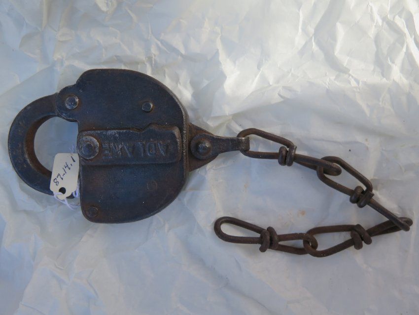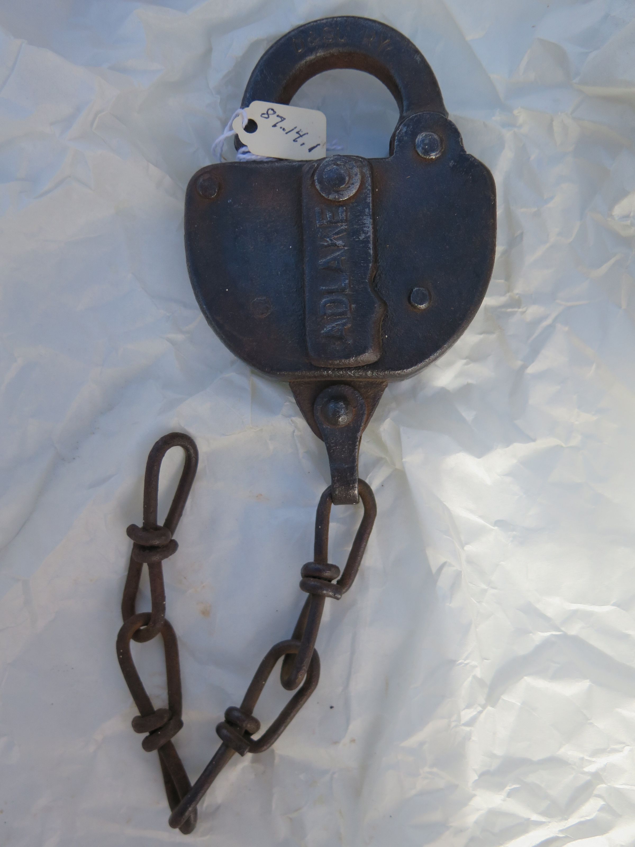 This is a metal Adlake brand D & SL Railroad Lock. The lock has a chain attached to it. The lock measures 12.5" (h) x 3" (w) x 0.5" (d).