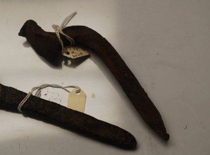 This is a bent metal railroad spike. The spike is rusting. The spike measures 2.25" (w) x 5.75" (l).