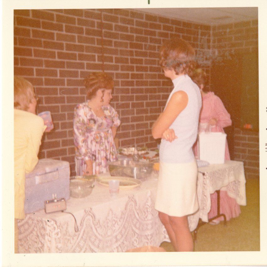 Lady in a shirt and skirt crossing her arms at a white table with designs.