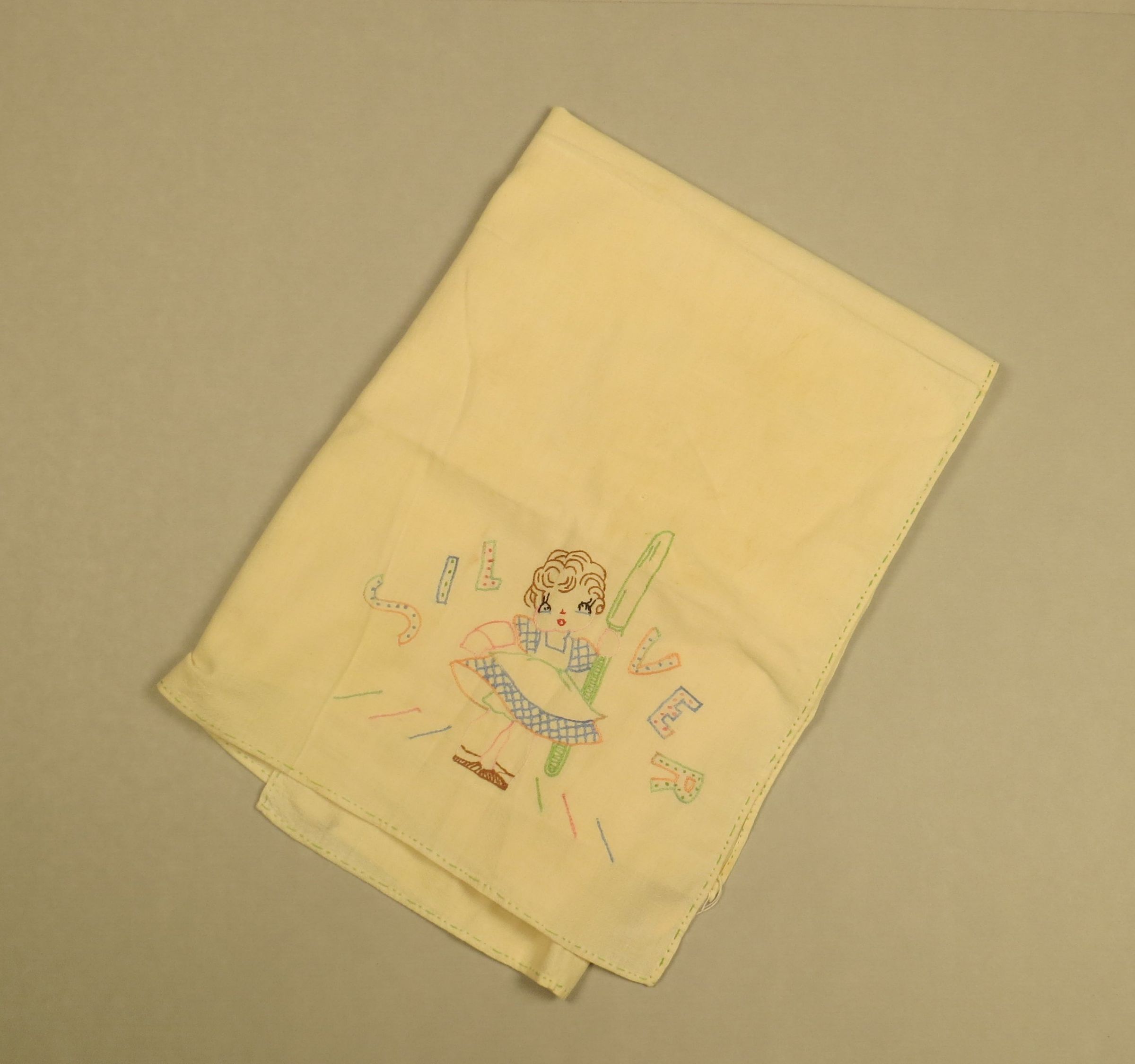 White tea towel with an embroidered girl in dress and test "Silver." Towel measures 6" (w) x 10" (l).