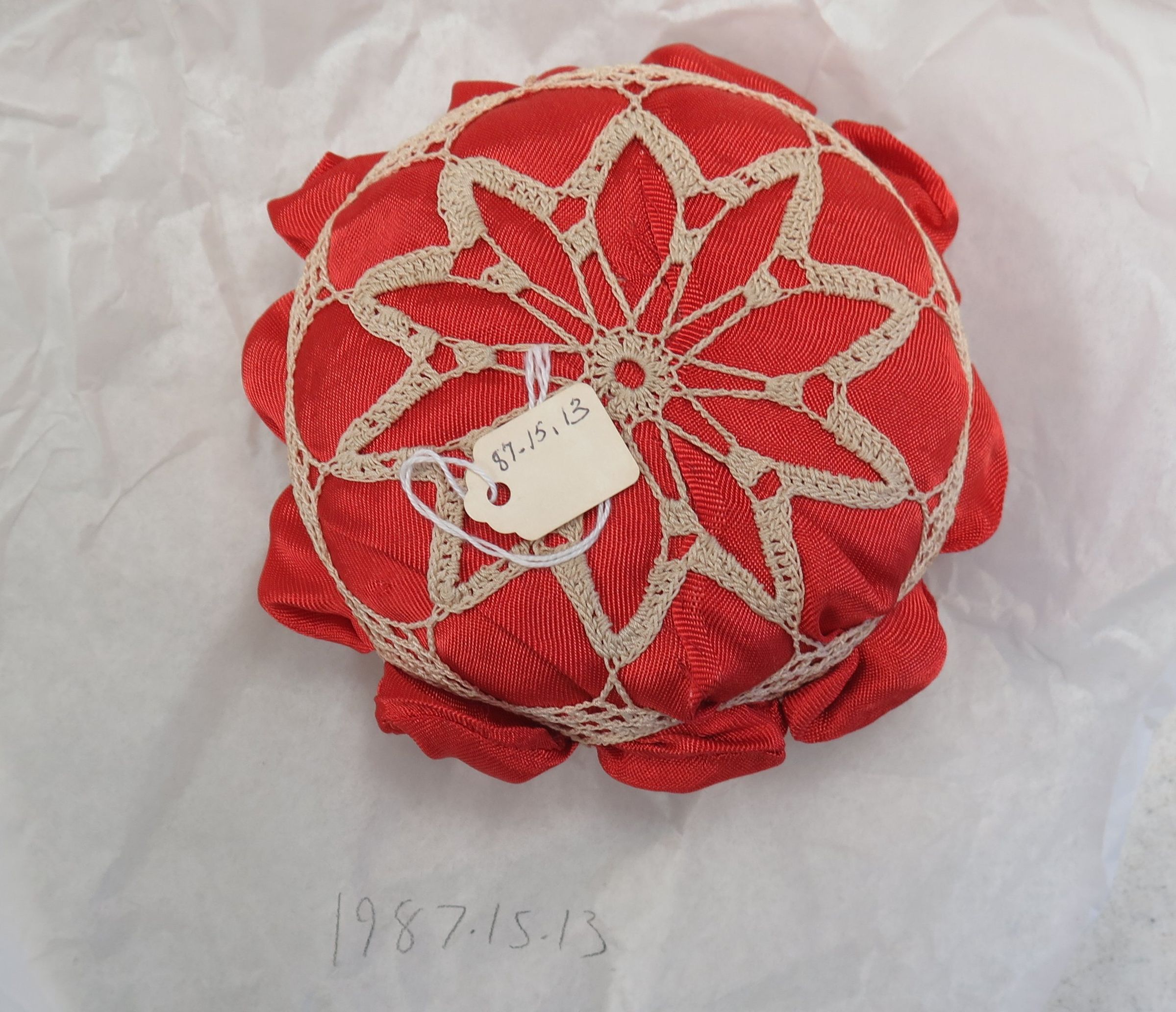 Top of pincushion.: Origsize: 2.5" (h) x 5.5" (dia; Origformat: Artifact