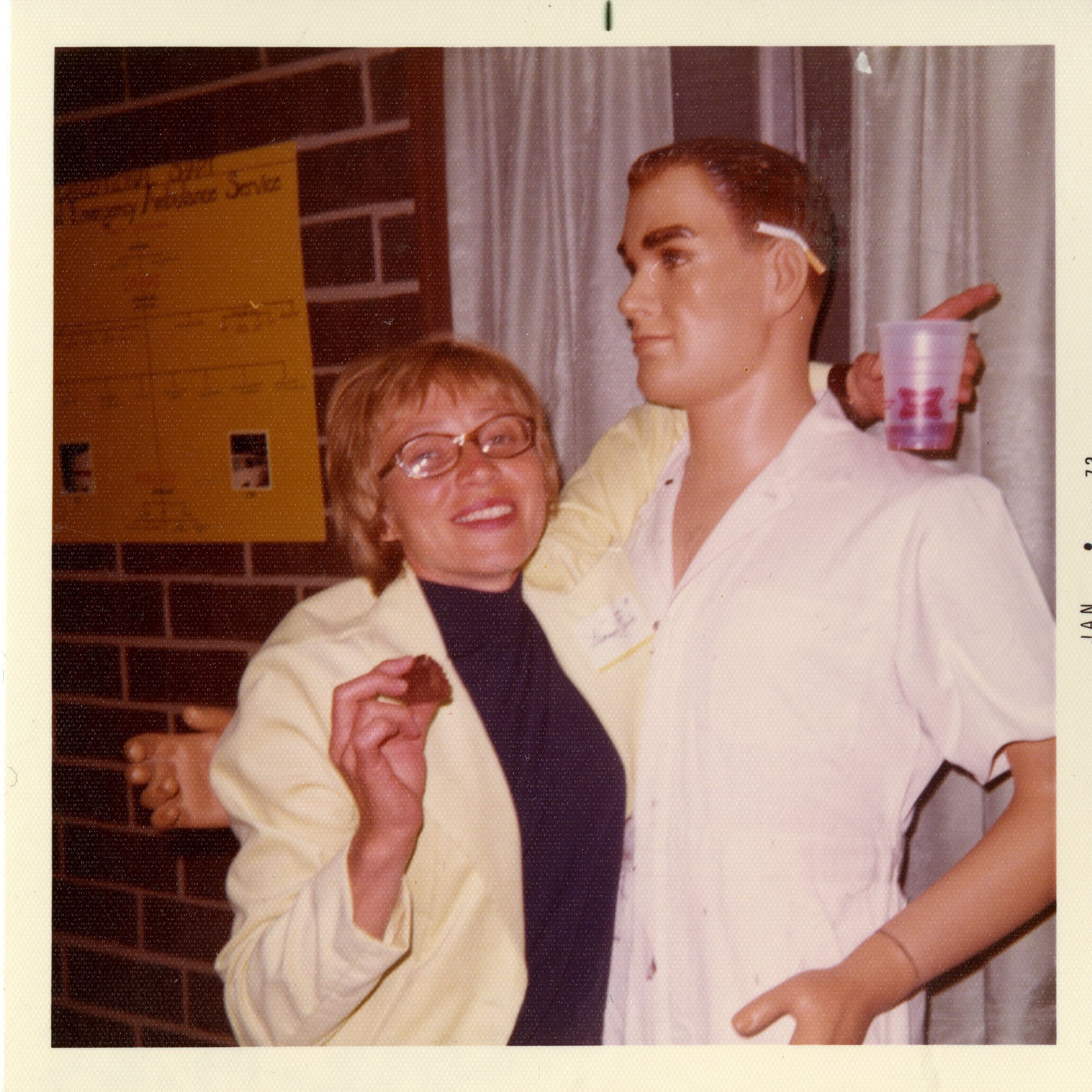 An unidentified lady with glasses with an arm around a mannequin in a white button down shirt.
