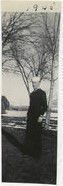Black and white photograph of a man in a naval uniform standing in a yard. Behind the man is two trees without leaves. In the background is a barn and a snow-covered field. The man is probably Clyde Brunner.