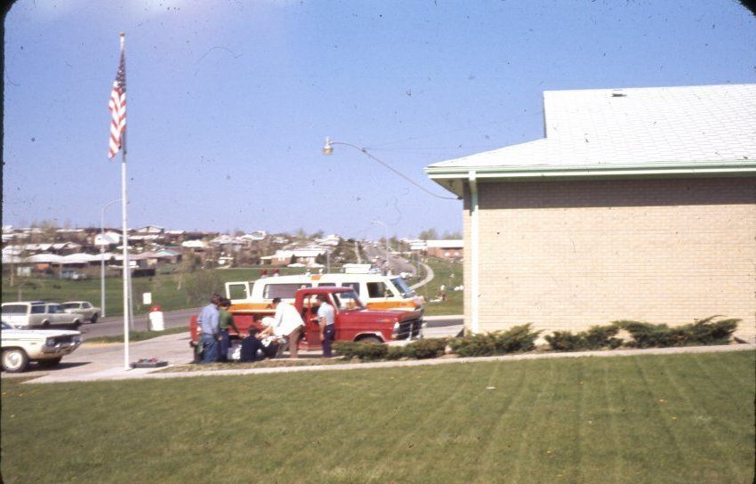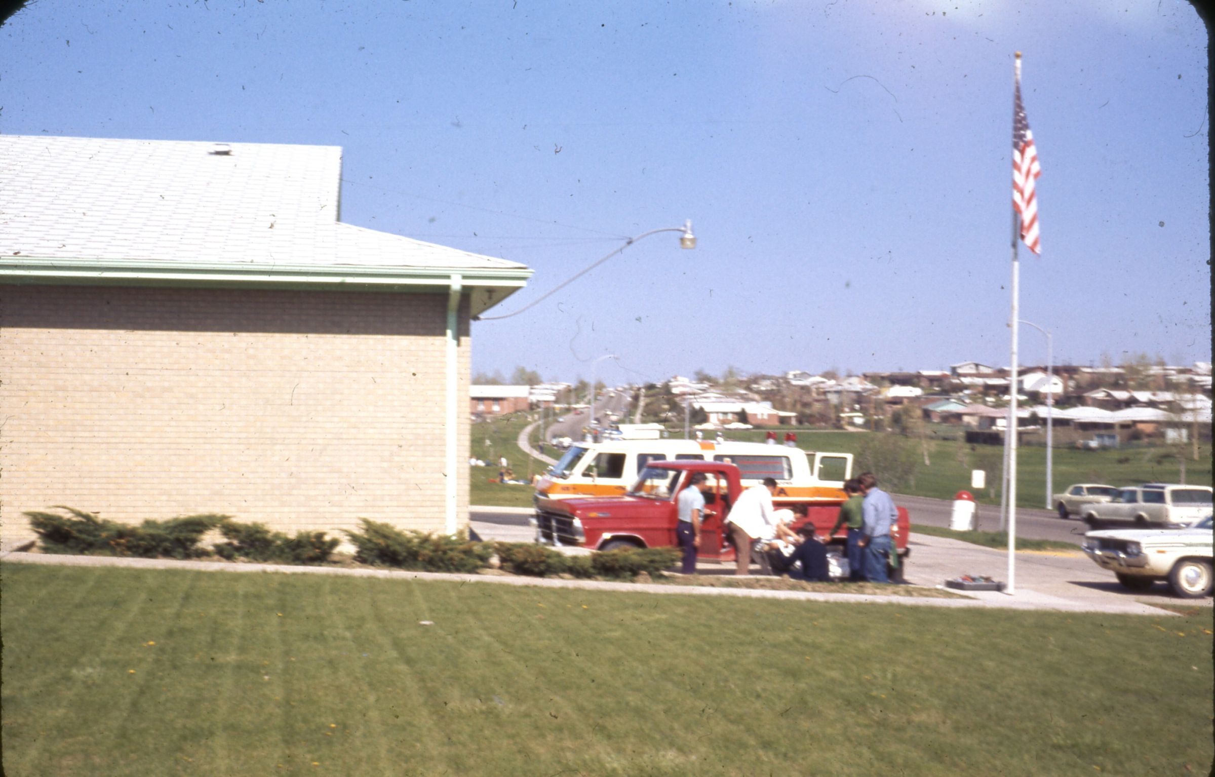 Colored slide with Broomfield Ambulance Service squad near a red truck at North Metro fire building