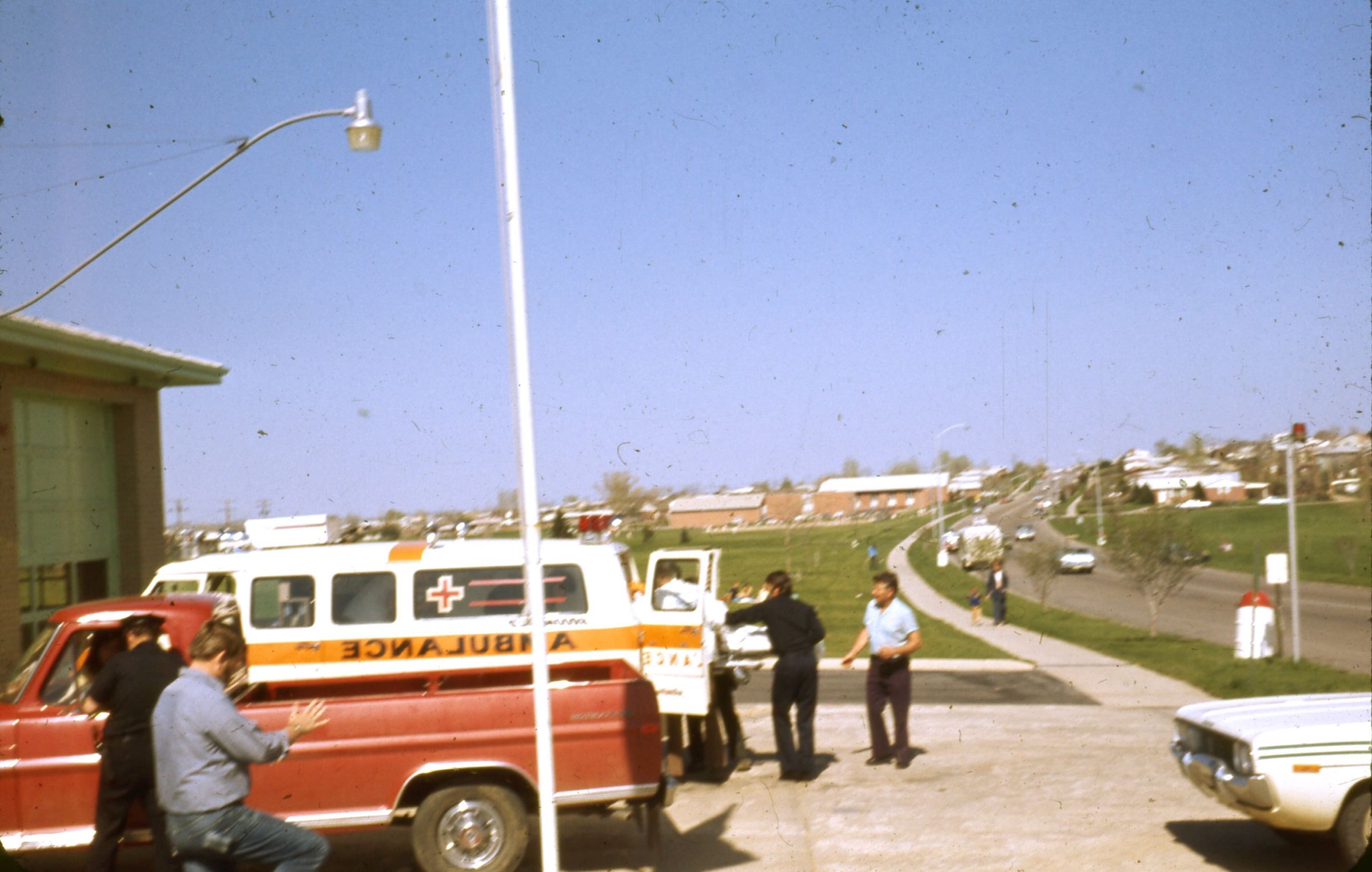 Colored slide with Broomfield Ambulance Service squad near a red truck at North Metro fire building.