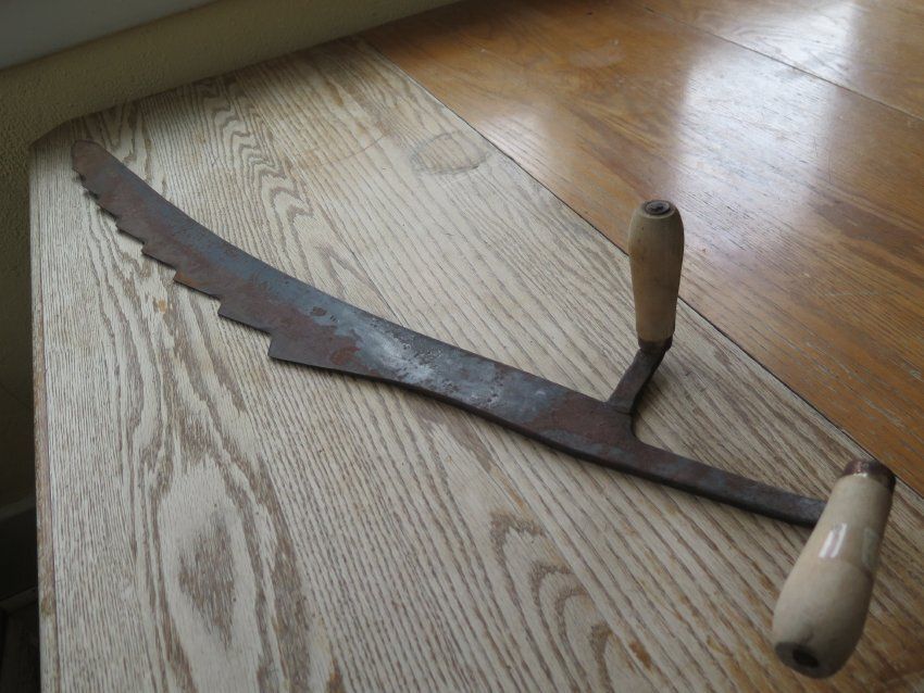 Metal hay-stack saw that has two wooden handles, one of which is labeled as an ice saw. The saw measures 4.5" (h) x 8" (w) x 35" (l).Collection