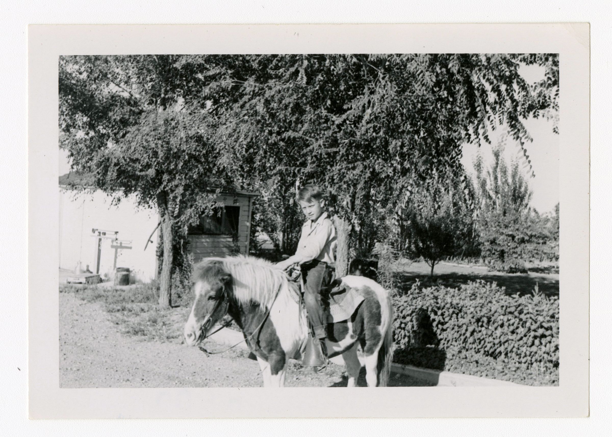 Black and white photograph of a boy on a pony. The boy is wearing jeans and a collared shirt. The photograph was taken outside, possibly in a dirt driveway. The boy is probably Lester K Brunner and the pony is probably Sweetie.