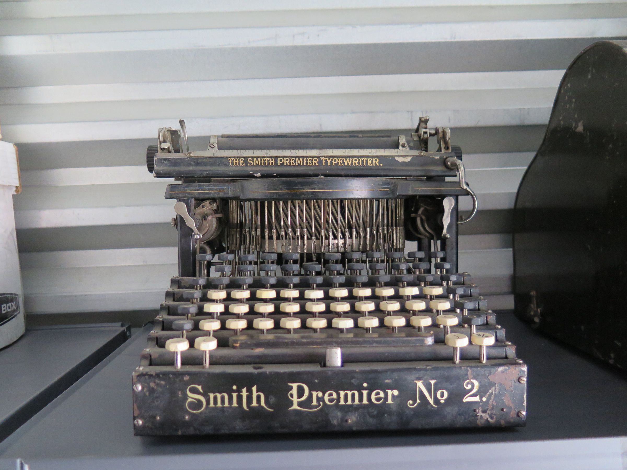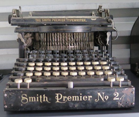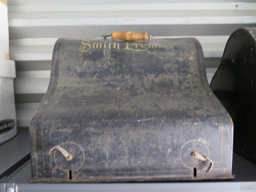 This Smith Premier No. 2 typewriter is composed of the following parts: a) typewriter, b) metal case, c) wood base for typewriter 13.75"(L) 13.75"(W) x .75"(D).