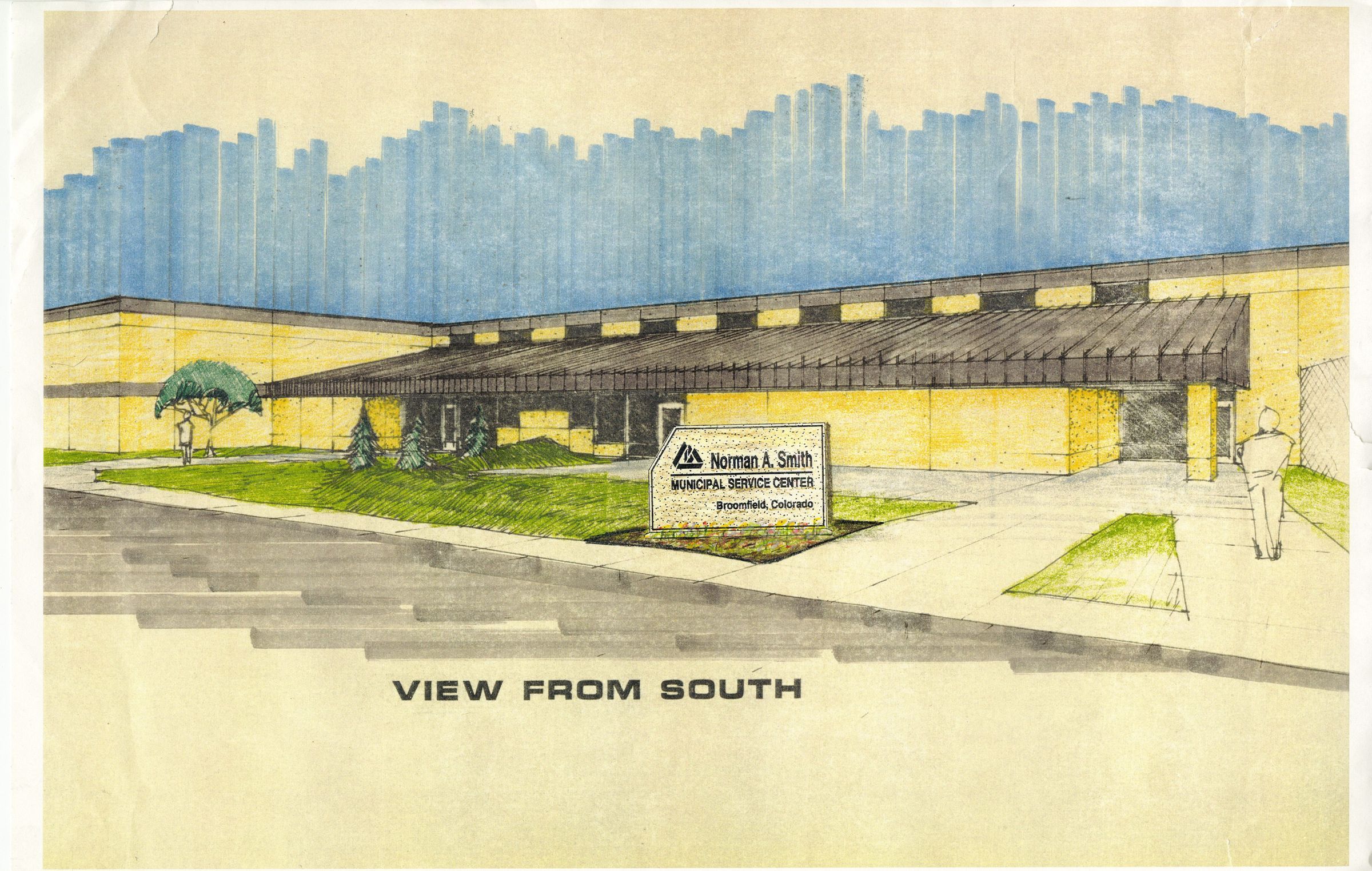 A colored architectural drawing of the south view of the Norman A. Smith Municipal Service Center. Artist unknown.