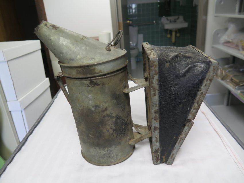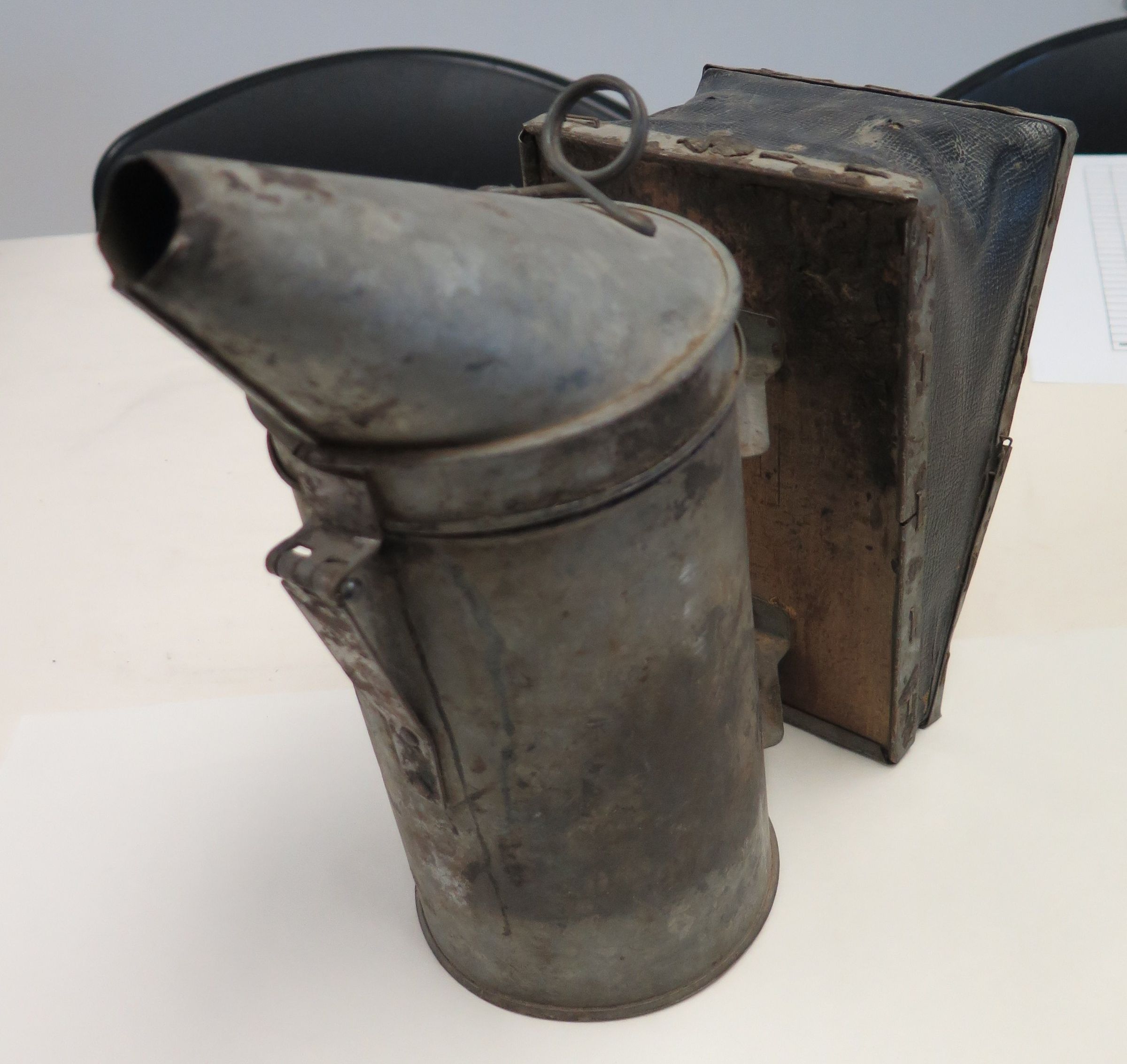 This is a bee smoker made of metal, wood, and leather. The smoker measures 9" (h) x 5" (w) x11" (l).