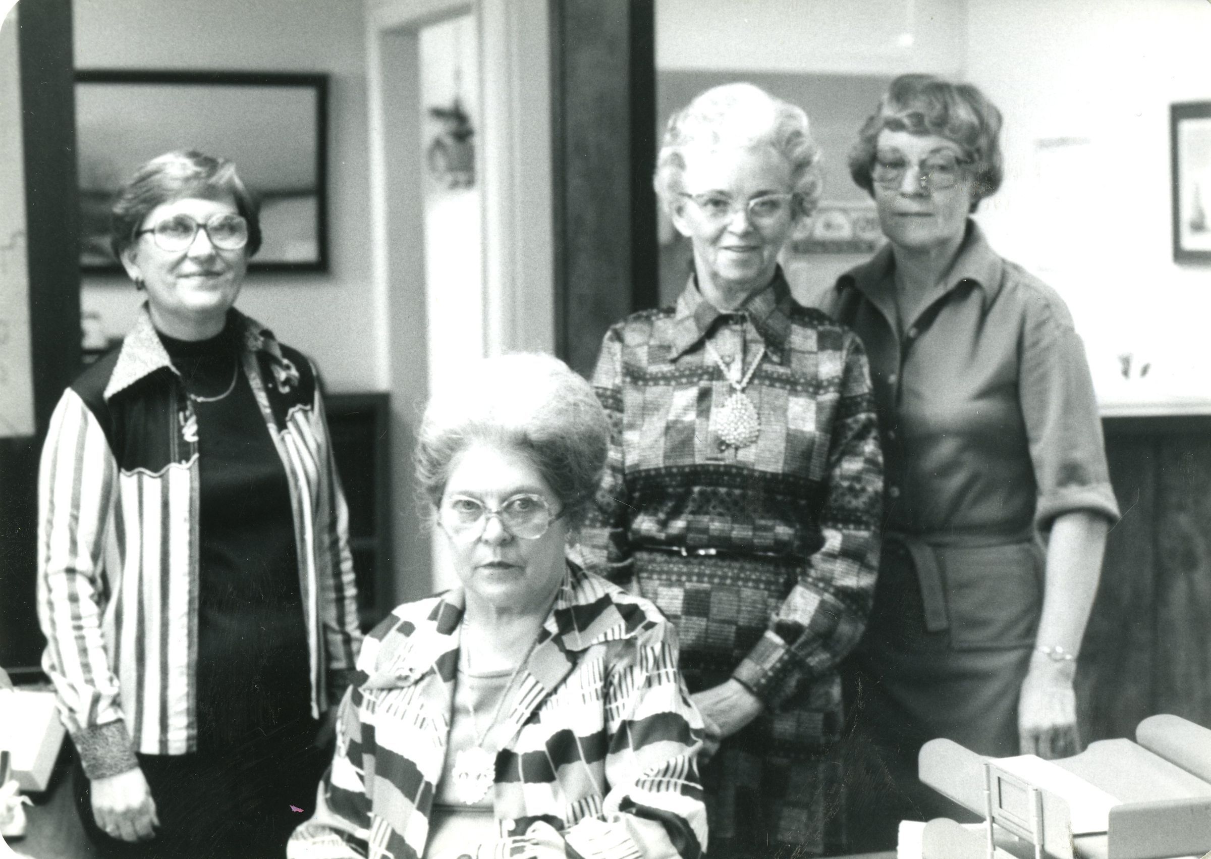 Four women, probably city workers. Office setting. B&W photo. Photo includes Wilma Reddish, Mary Jane Bayles, Lucy Brown - city clerk.Collection