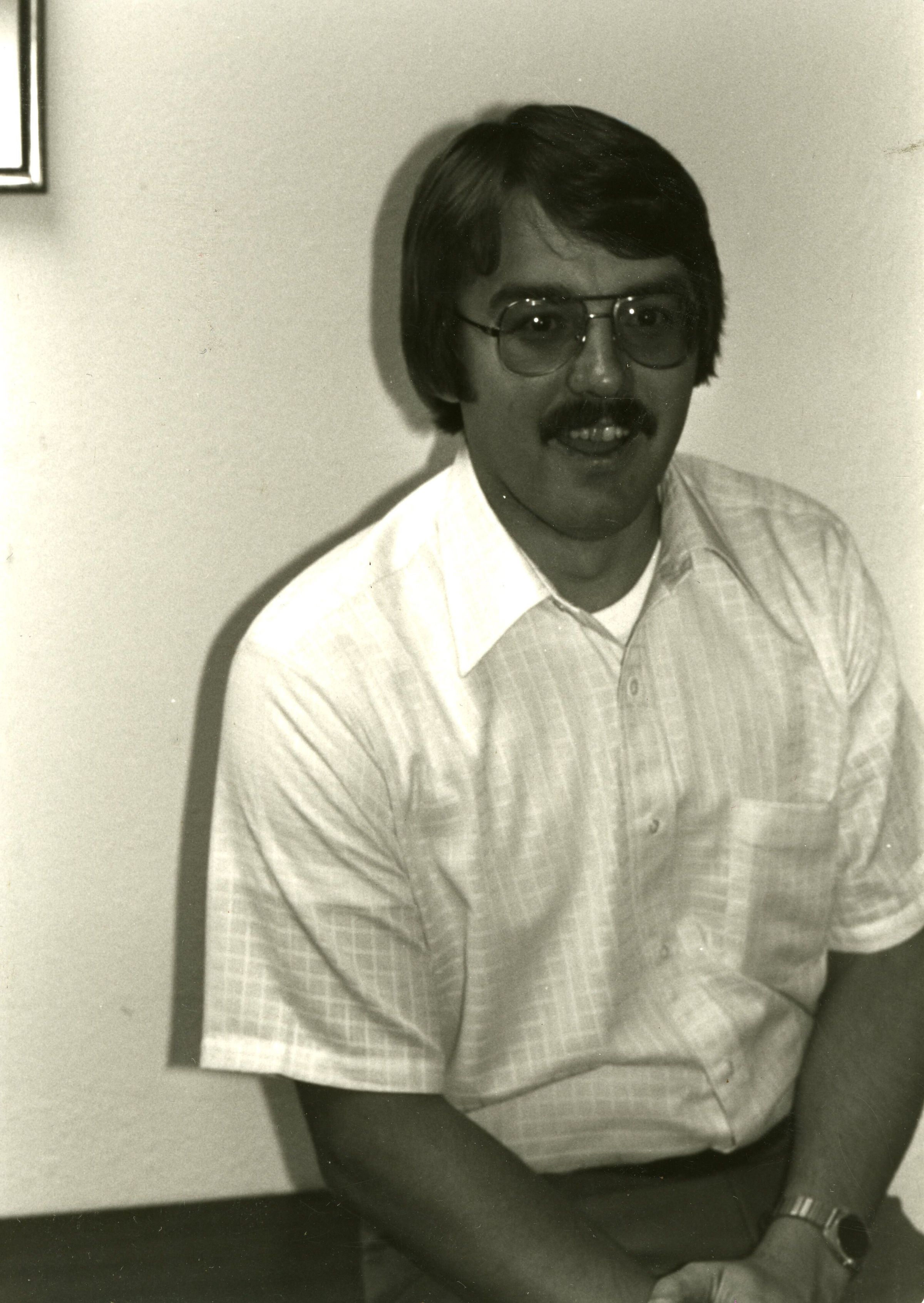 Man with mustache, Dave Shelly - assistant planning director, in white button-up short-sleeved shirt. B&W photo.