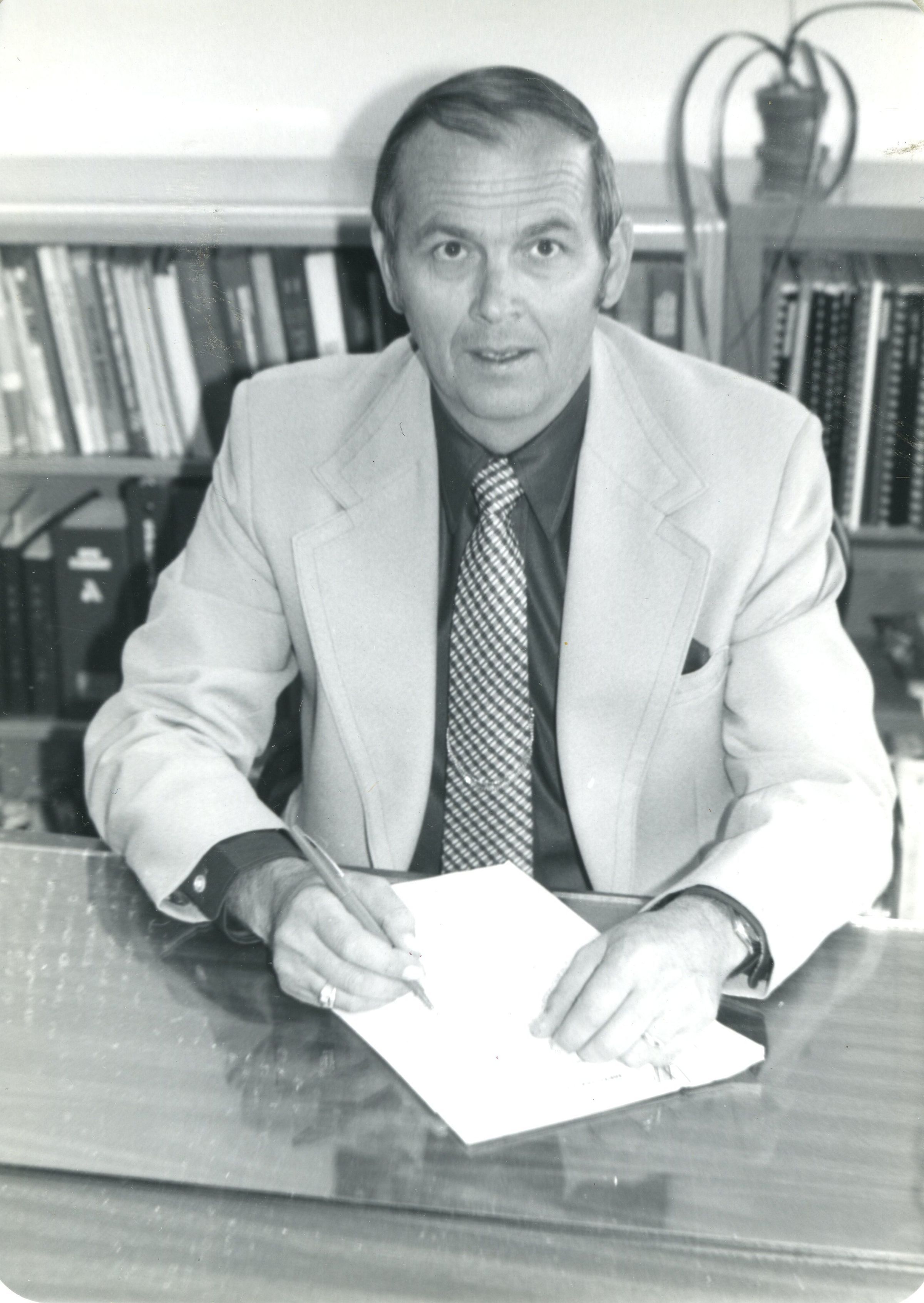 Man in jacket and tie, Marvin Thurber, sitting at desk with pen and paper. B&W photo.