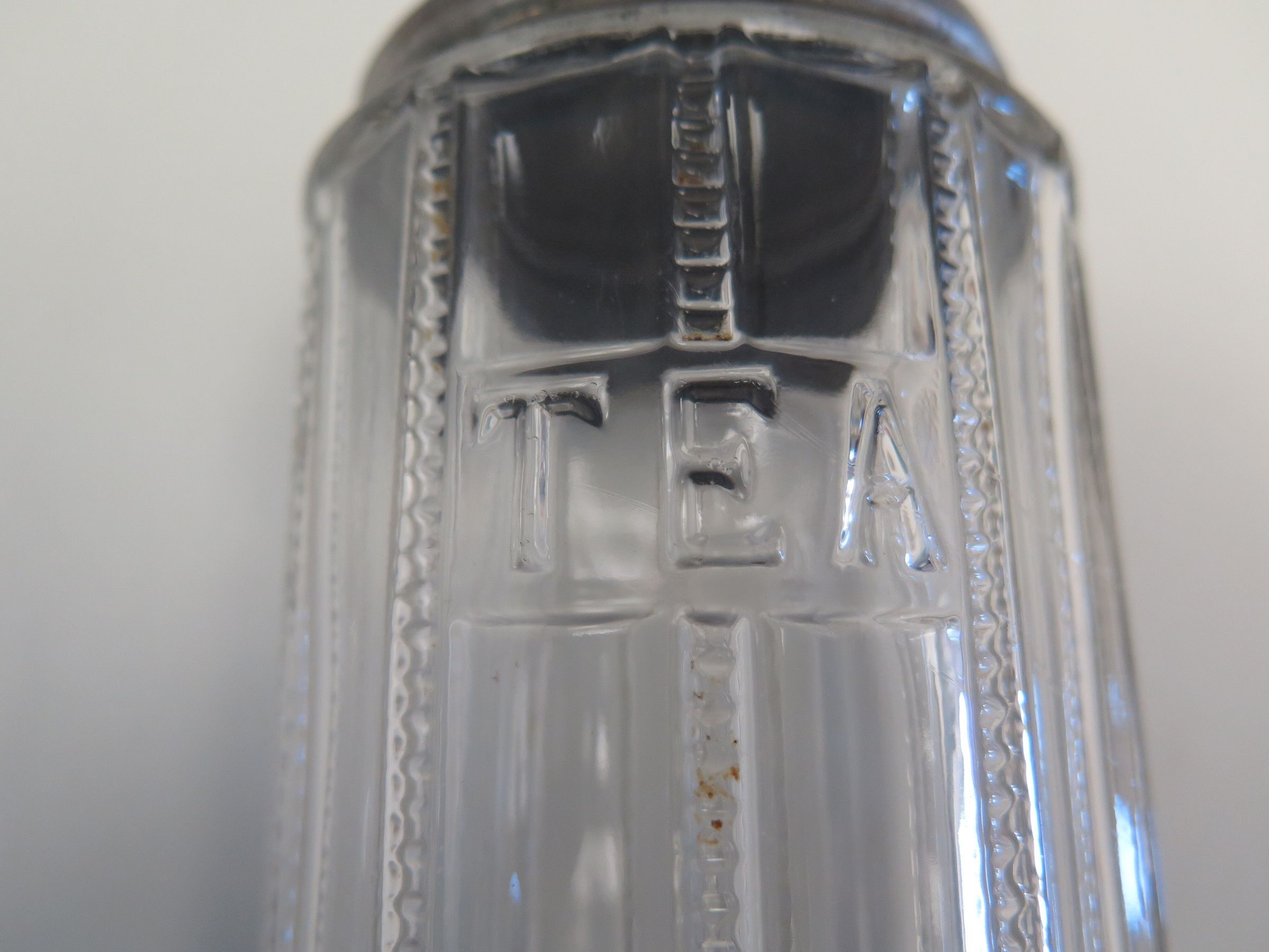 This is a clear glass jar that is round with a design cut into the glass. The word "TEA" appears on the side of the jar. The jar has a metal lid (a). The jar measures 4.5" (h) x 3.25" (dia).Collection