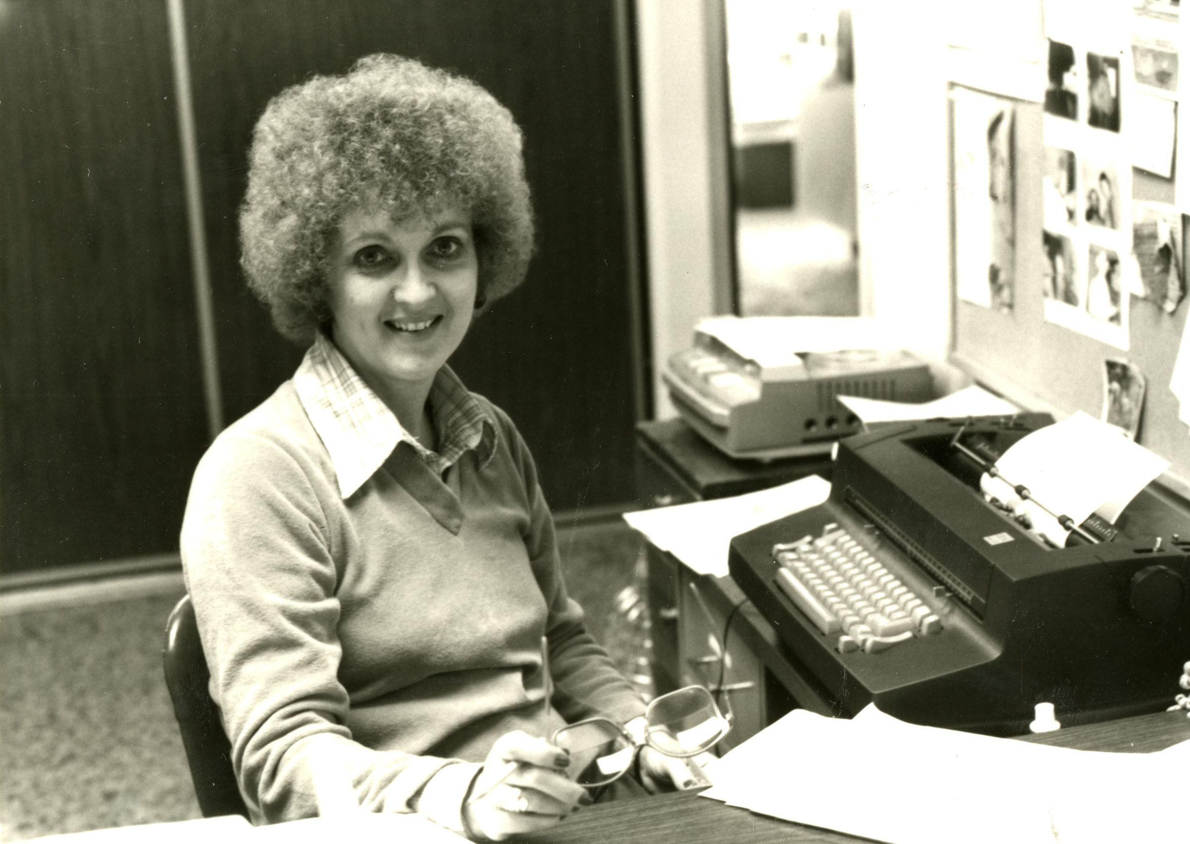 Pat Caulfield - Parks and Rec & Public Works Secretary, sitting at desk with typewriter. B&W photo.Collection