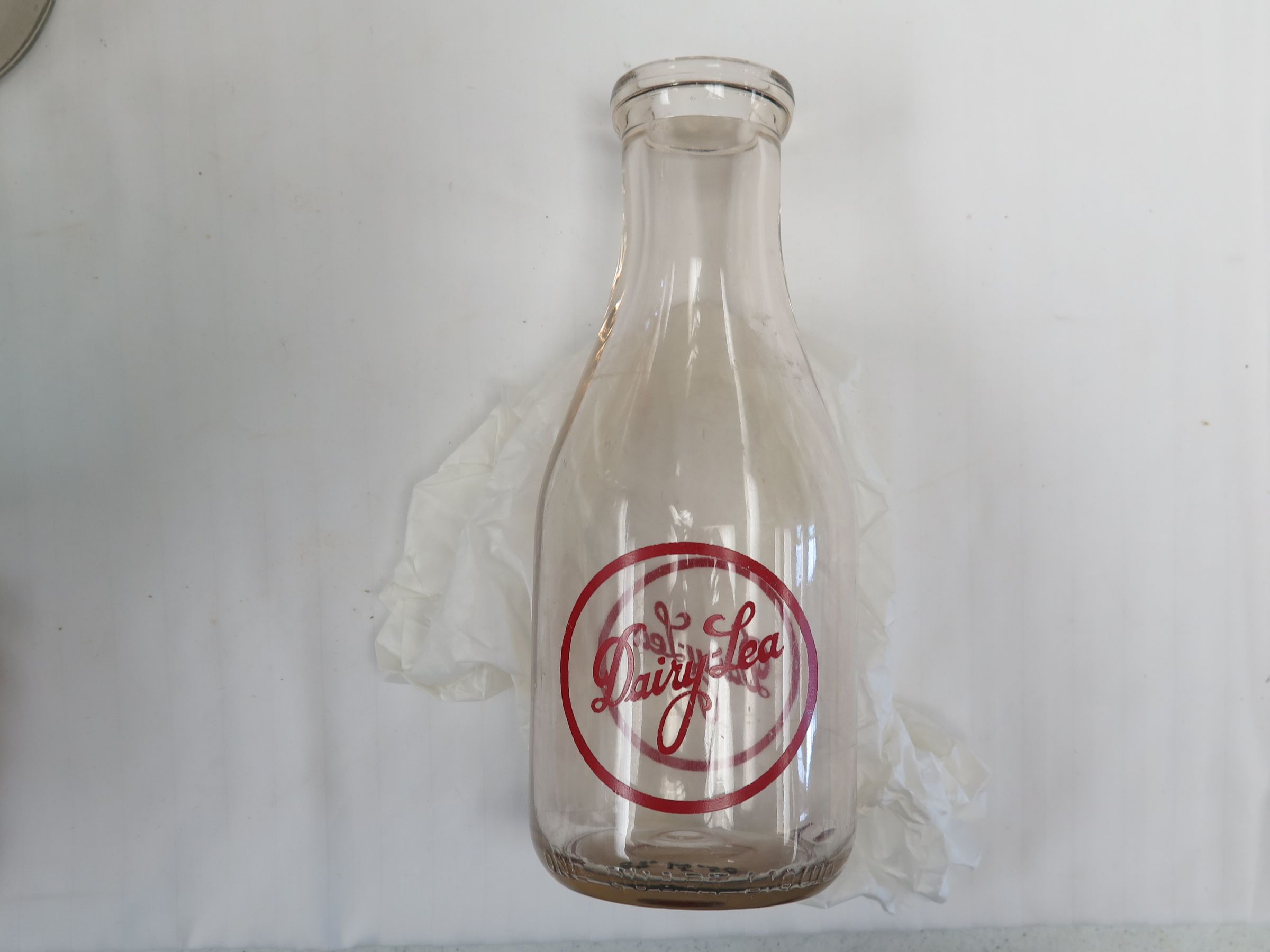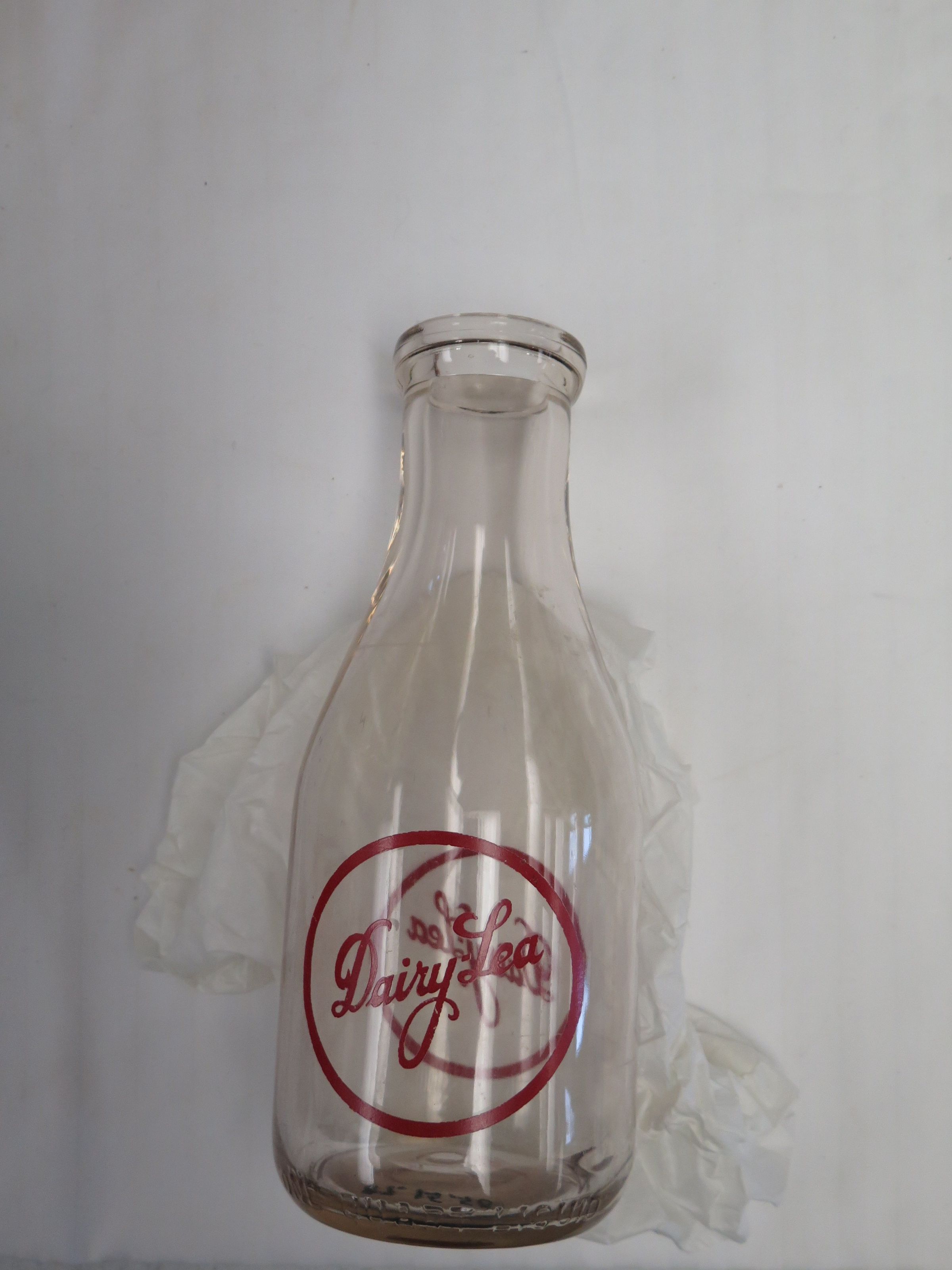 This is a clear glass milk bottle without a lid. The side of the milk bottle has red text that reads,"Dairy Lea. The milk bottle measures 10" (h) x 3.5" (dia).