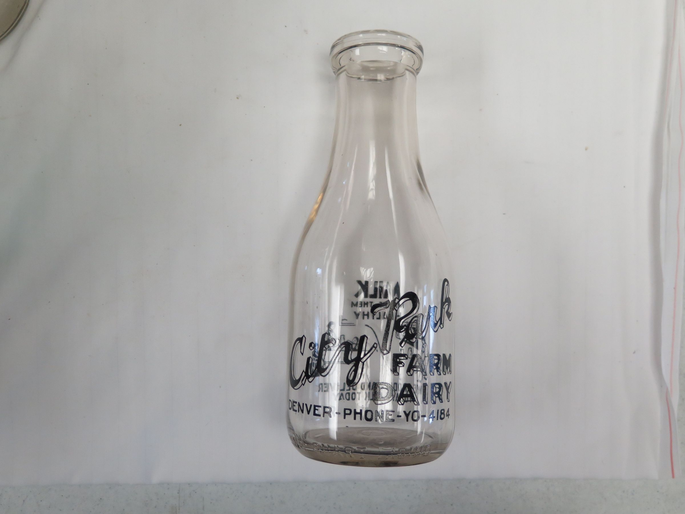 This is a clear glass milk bottle with black text on the sides and a round base. The text reads, "City Park/ Farm/ Dairy/ Denver- Phone- YO- 4184". The milk bottle measures 9.5" (h) x 3.5" (dia).