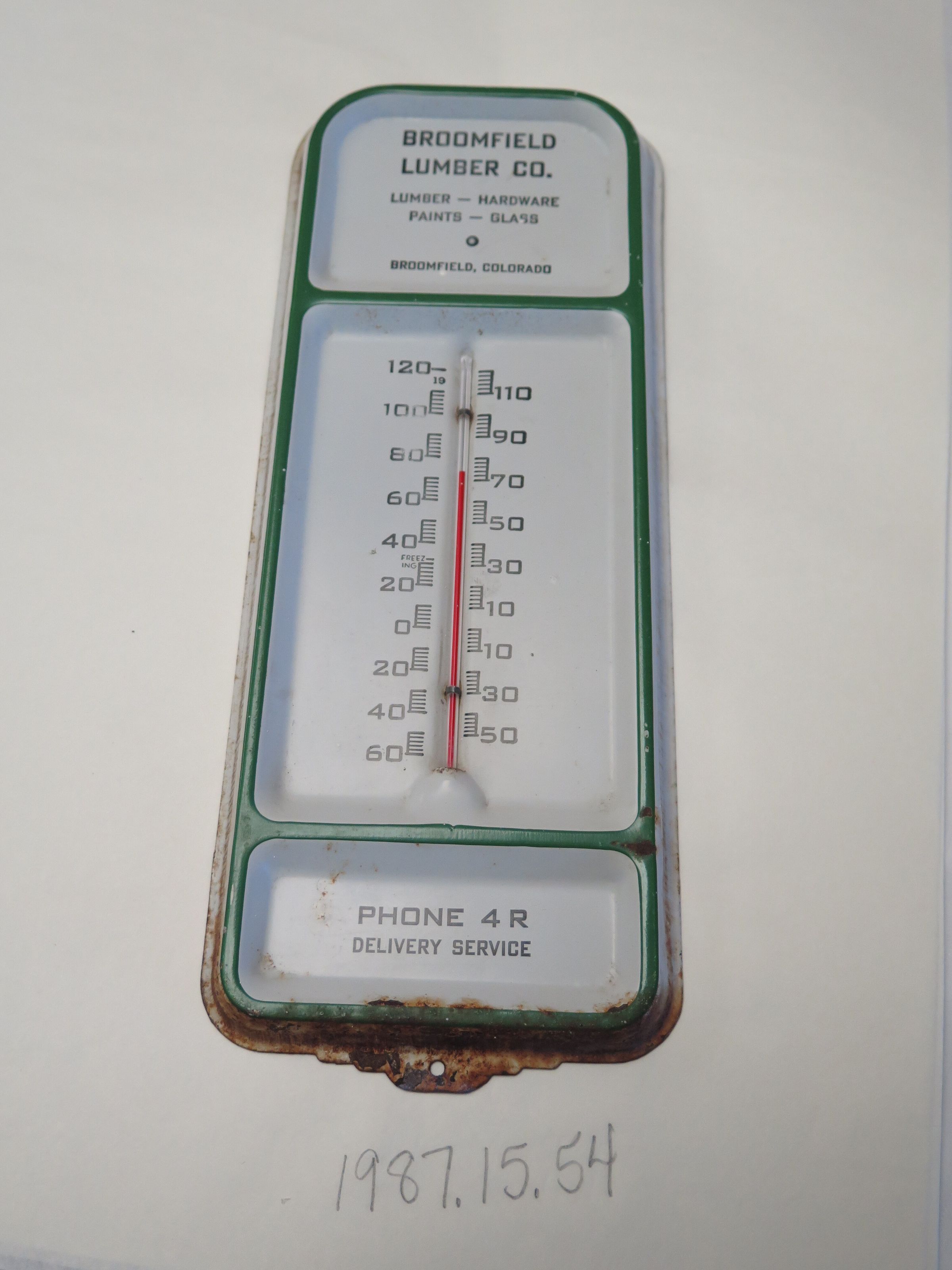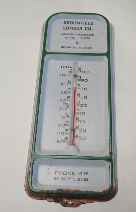 This is a white metal "Broomfield Lumber" wall thermometer with a green boarder. The thermometer measures 11" (h) x 4" (w).Collection