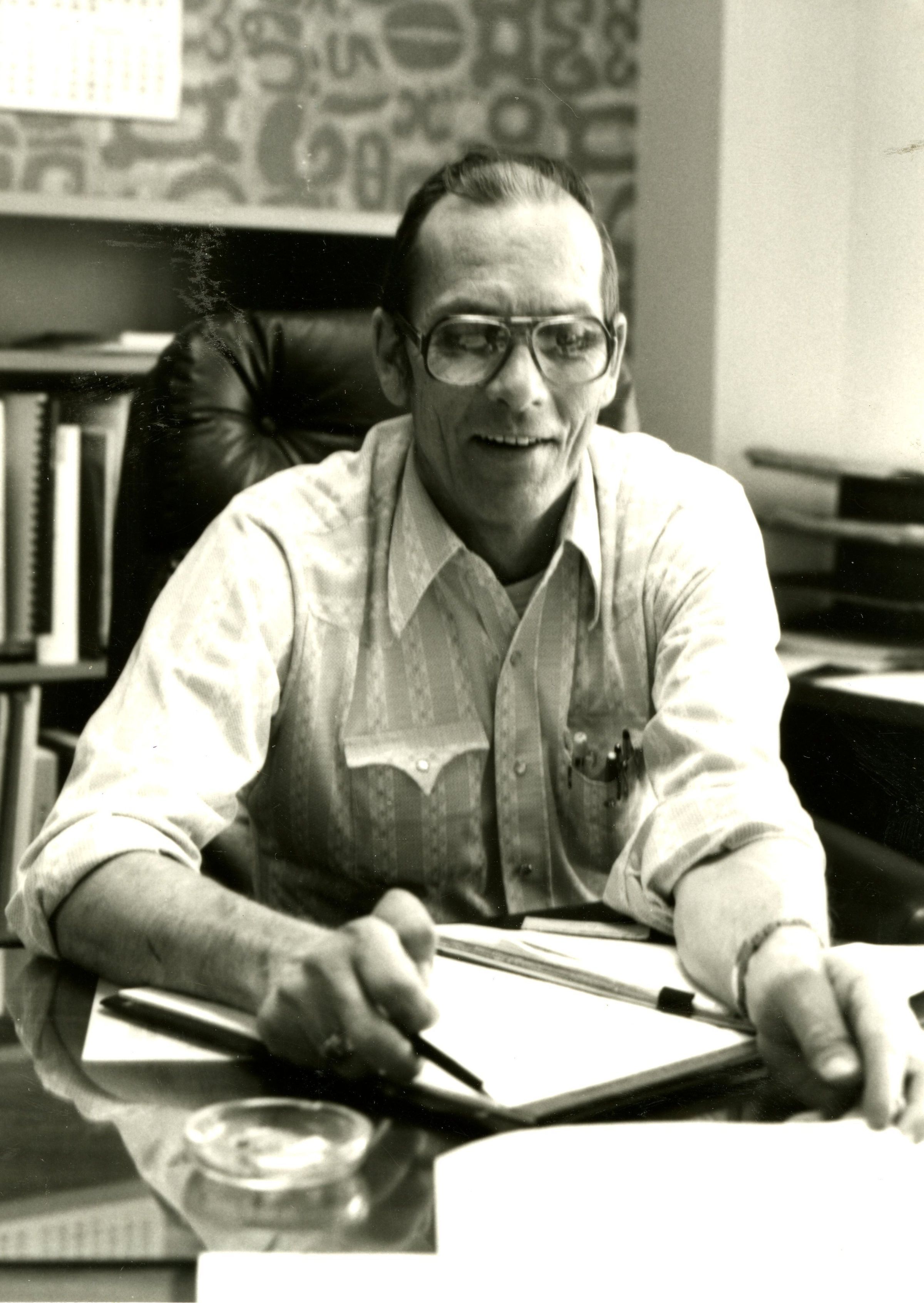 Gip Wilson with glasses wearing western style button-up shirt, sitting at desk. Same man pictured in 2022.12.16. B&W photo.