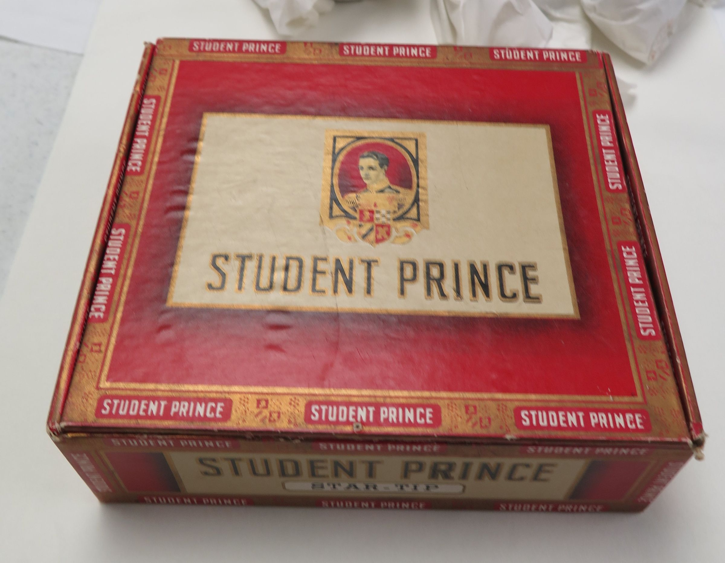 This is a cigar box which measures 2.5"(H) x 7.25"(W) x 6.25"(D). It is covered in a red paper label which reads "STUDENT PRINCE" on the box lid with a small image of a young man in uniform bearing a family crest.